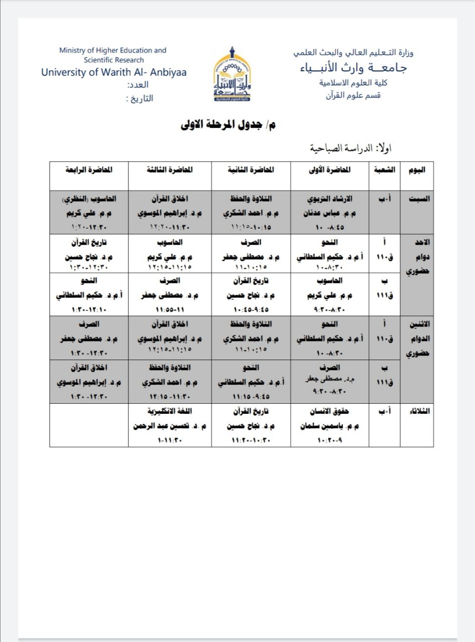 جدول الدروس اليومي للمرحلة الأولى / الدراسة الصباحية والمسائية / قسم علوم القرآن