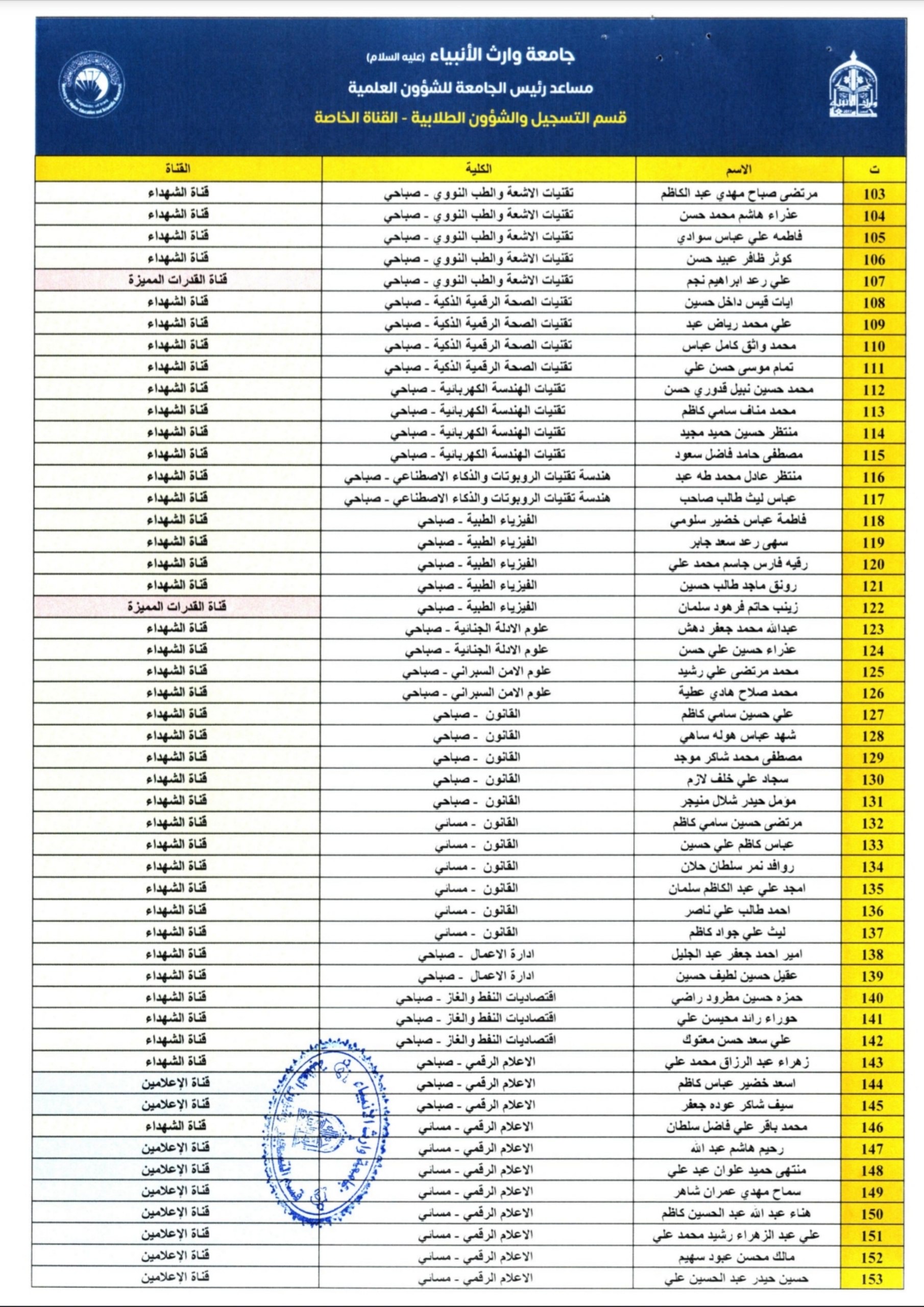 الطلبة الأعزاء المدرجة أسماؤهم ضمن القوائم القبول في