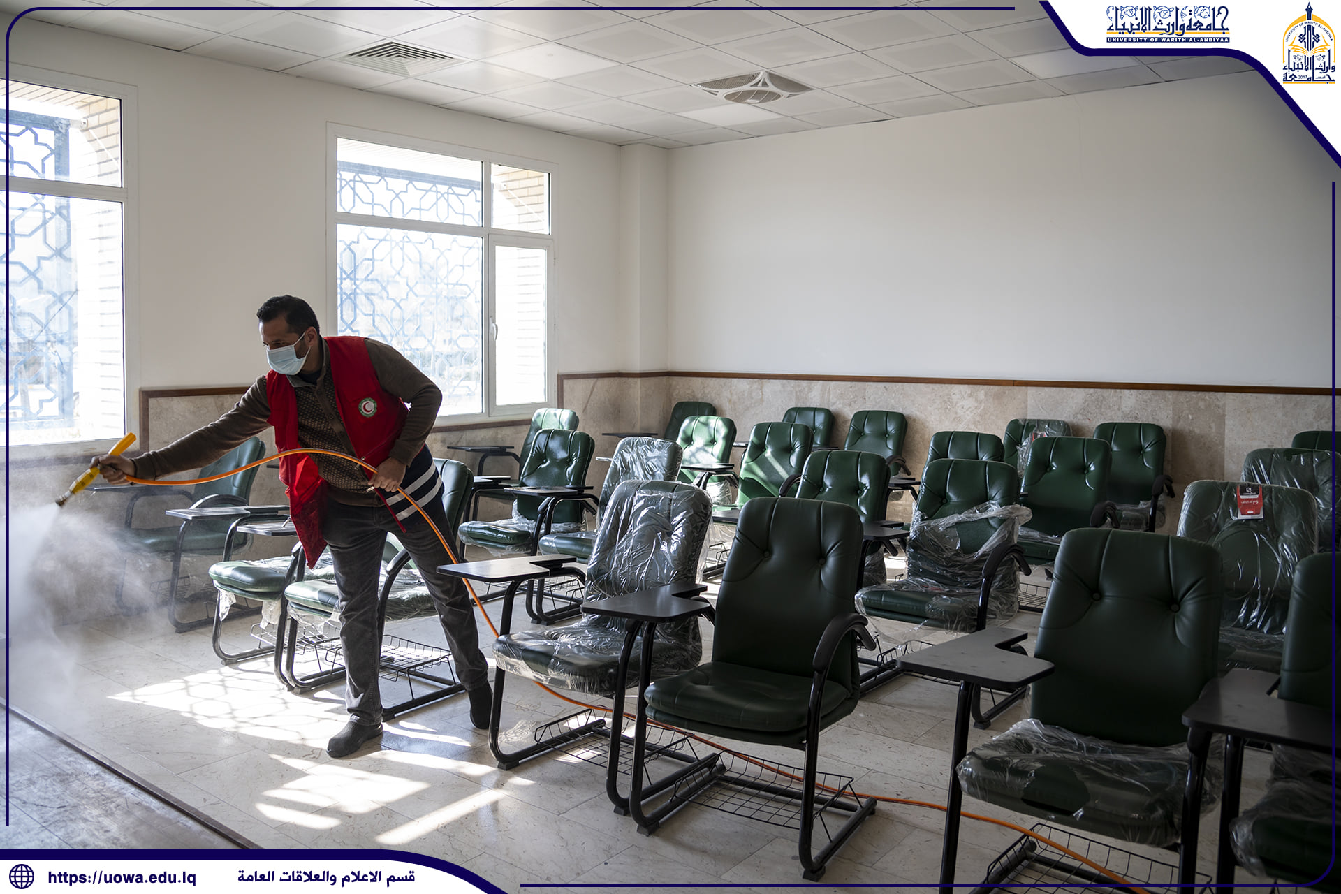 بالصور .. حملة تعفير تنفذها جامعة وارث الانبياء(عليه السلام) بالتعاون مع جمعية الهلال الاحمر العراقية لتعفير ابنية الجامعة وقاعاتها الدراسية والمختبرات العلمية واروقة الجامعة حفاضا على سلامة الجميع.