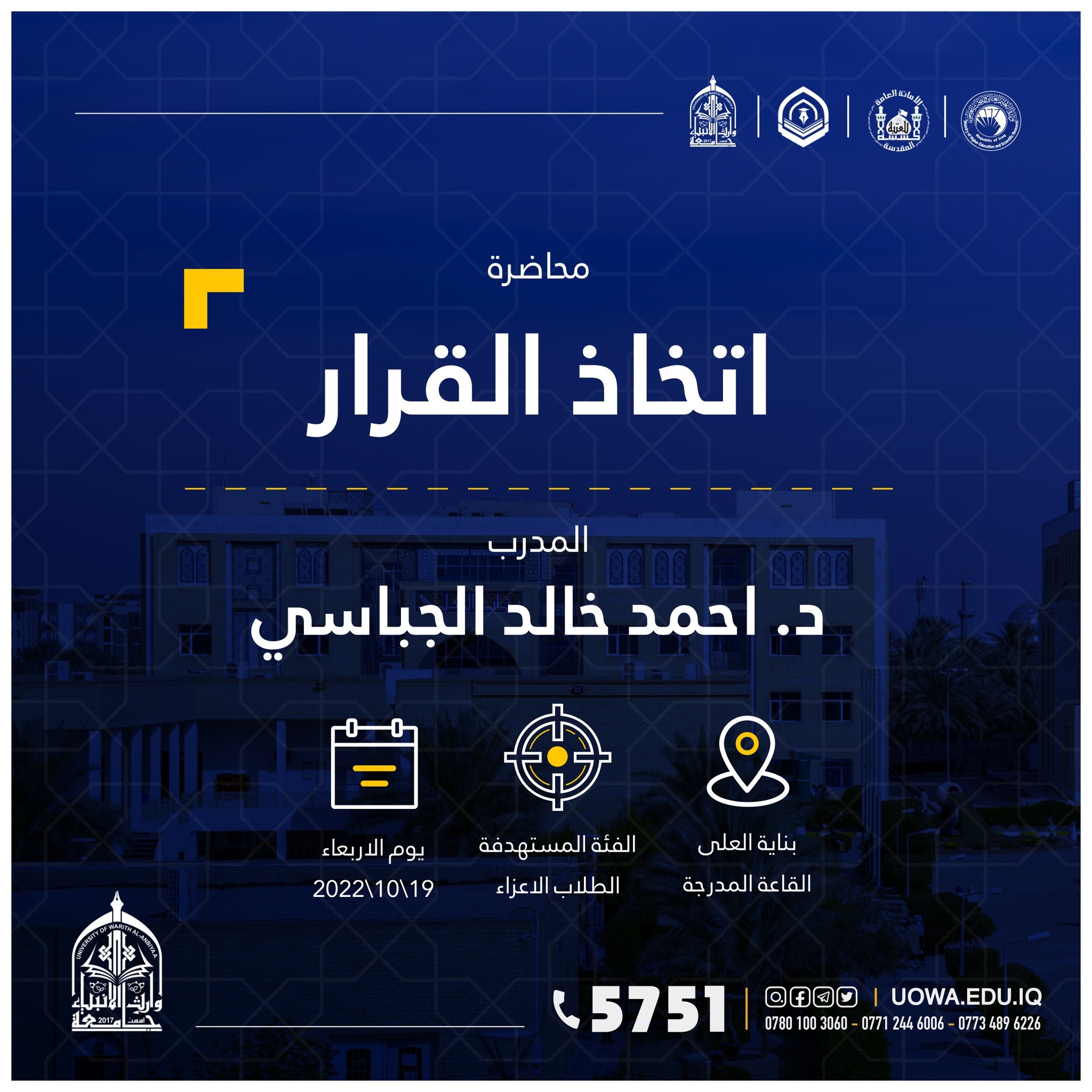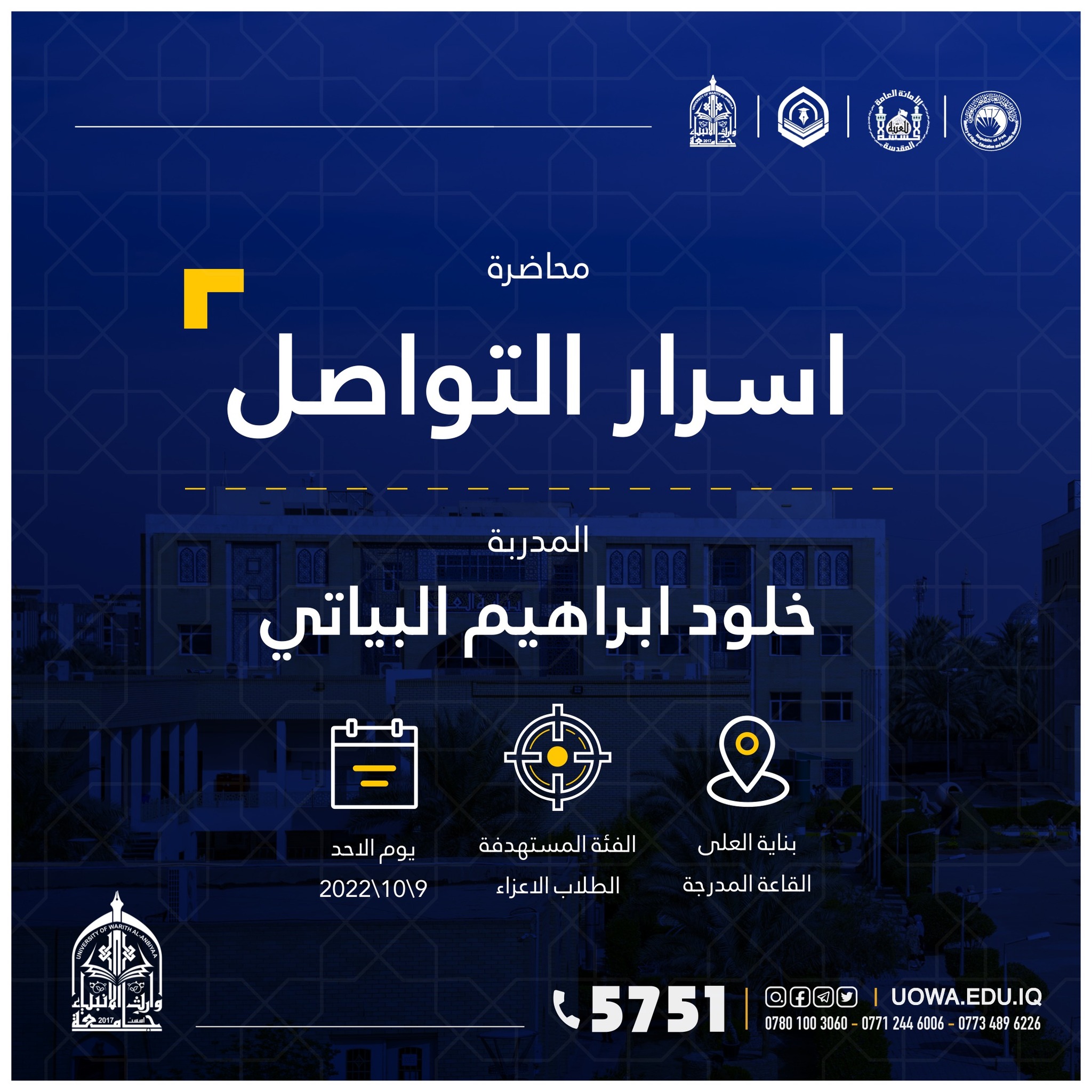 "طلبتنا قادة المستقبل" برنامج تدريبي يطلقه مركز التعليم المستمر في جامعة وارث الانبياء(عليه السلام) لطلبة الجامعة ،ابتداءً من يوم الاحد المصادف 9/10/2022 ،ولمدة تسعة ايام.