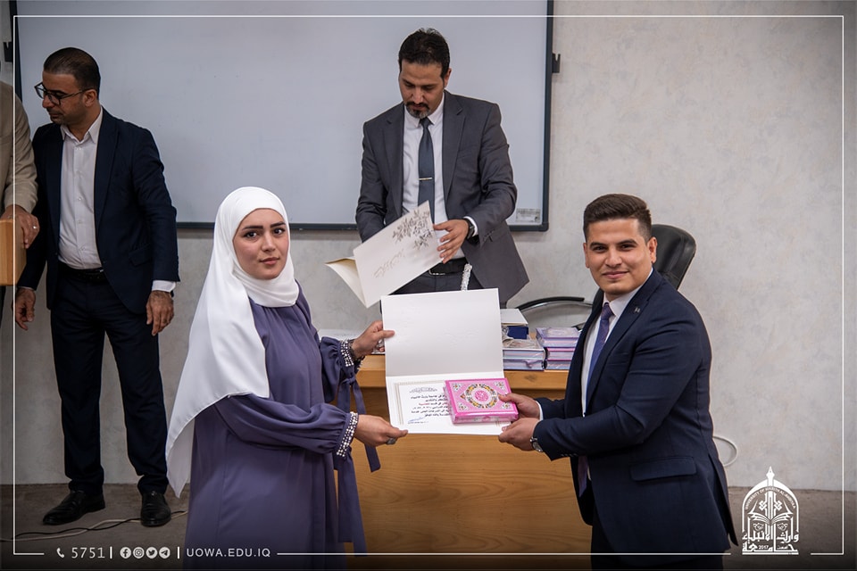 اقامت كلية الإدارة والاقتصاد في جامعة وارث الانبياء (عليه السلام) احتفالية لتكريم الطلبة الاوائل في قسمي المحاسبة وإدارة الاعمال، وفي كلمة القاها في الحفل بين السيد عميد الكلية الاستاذ الدكتور عواد الخالدي أن هذا التكريم جاء لتثمين جهود الطلبة في الدراسة والتفوق وتشجيعهم على بذل المزيد، وتحفيزاً للطلبة الاخرين ليحذوا حذو زملائهم .