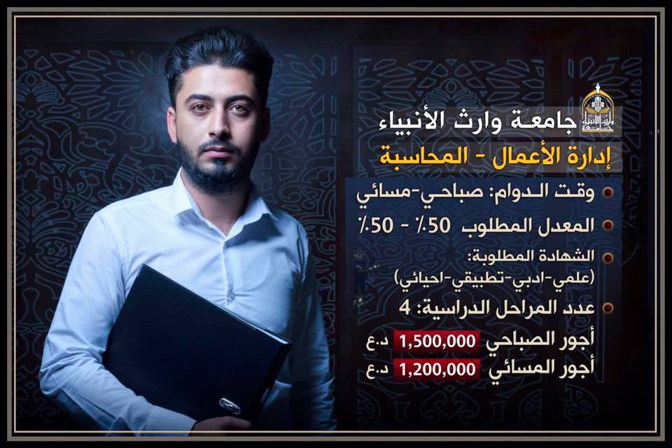 عاجل عاجل الى خريجي الدراسة الاعدادية (الدور الثالث) ندعو طلبتنا الاعزاء الراغبين بالتقديم على #جامعة_وارث_الانبياء_التابعة_للعتبة_الحسينية_المقدسة للعام الدراسي ٢٠١٨-٢٠١٩ نعلمكم بان التقديم للقبول يبدء من اليوم الاحد في كليات واقسام الجامعة في مقر الجامعة