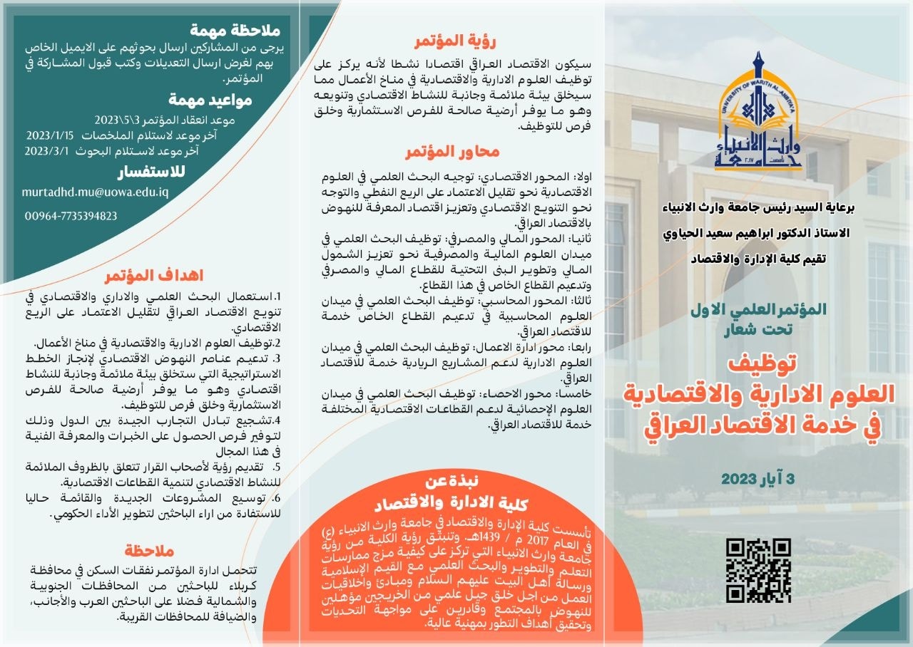 برعاية السيد رئيس الجامعة الاستاذ الدكتور ابراهيم الحياوي، أقامت كلية الإدارة والاقتصاد في جامعة وارث الانبياء(عليه السلام) "المؤتمر العلمي الاول"