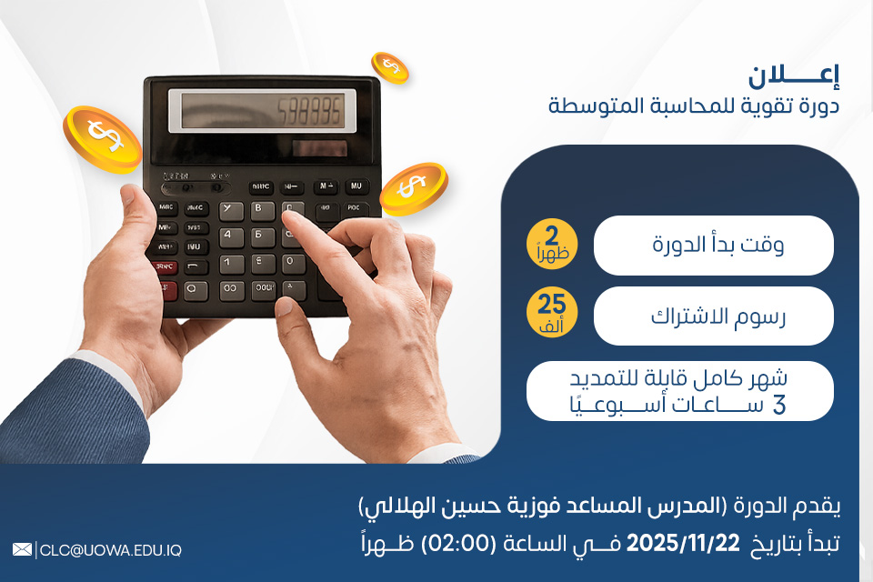 يسر مركز التعليم المستمر في جامعة وارث الأنبياء (عليه السلام) الإعلان عن فتح باب التسجيل على دورة تقوية للمحاسبة المتوسطة ، التي ستبدأ في 22/11/2025، يقدمها المدرس المساعد فوزية حسين الهلالي.