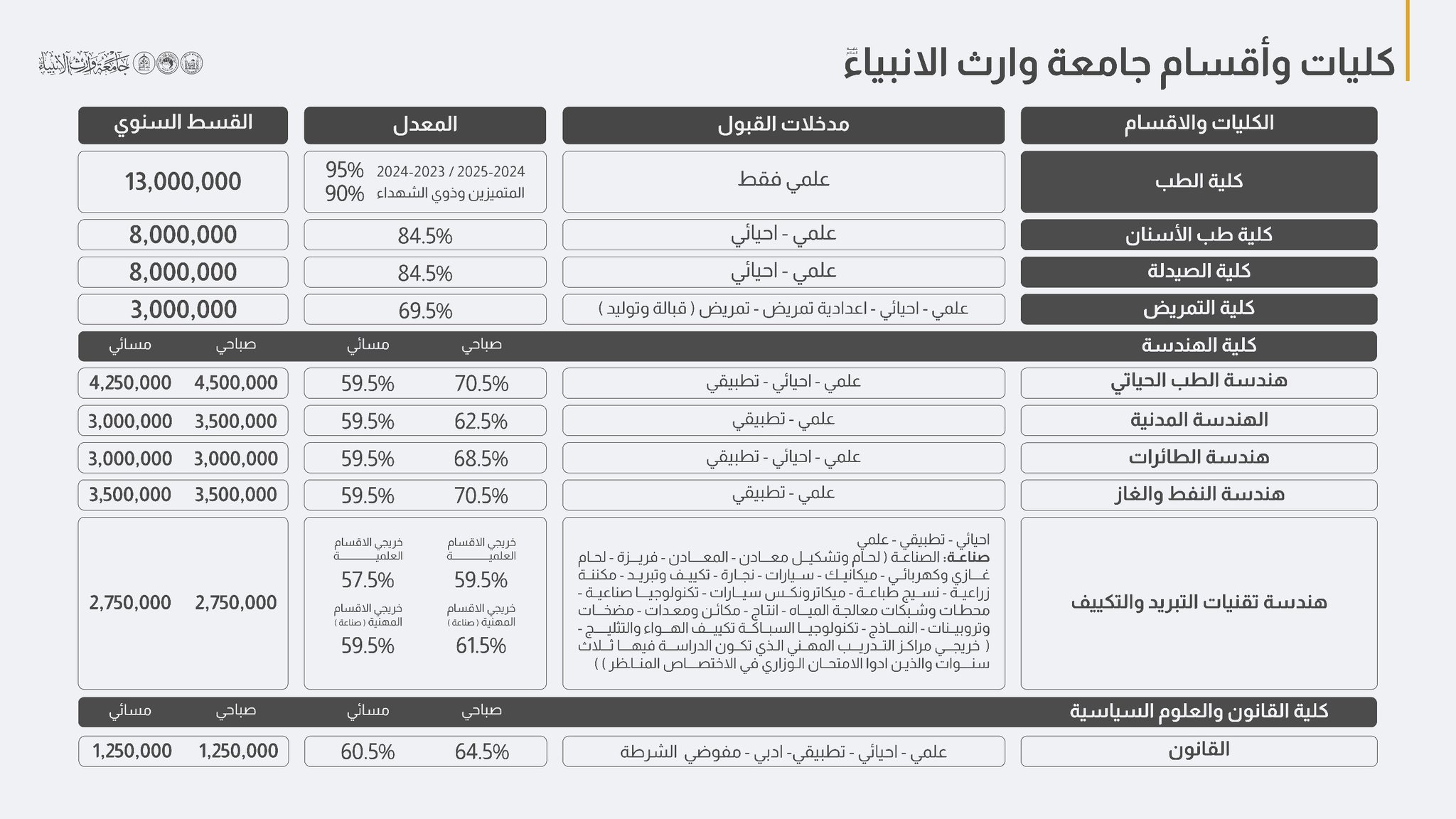 الرسوم: 25,000 دينار عراقي، تدفع في قسم الشؤون المالية بجامعة وارث الأنبياء (ع).