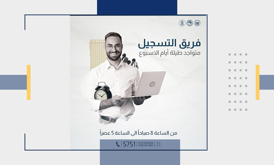 نود اعلام الطلبة الاعزاء ان فريق التسجيل متواجد طيلة ايام الاسبوع من الساعة 8صباحا الى 5 مساء