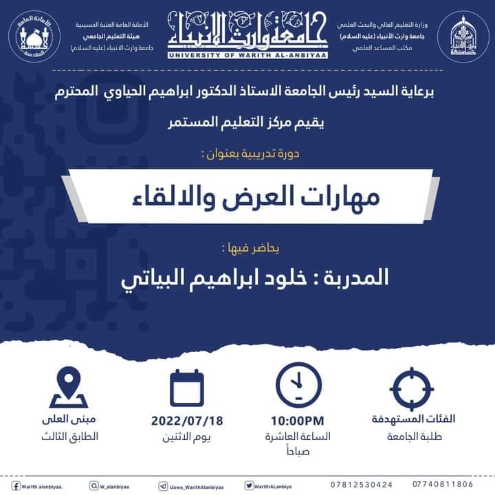 يقيم مركز التعليم المستمر في جامعة وارث الأنبياء (عليه السلام) وبالتعاون مع كلية العلوم الاسلامية دورة تدريبية بعنوان (التصحيح اللغوي في المخاطبات الرسمية) والتي تعقد ابتداءً من يوم السبت الموافق 21/5/ 2022 ولمدة ثلاثة أيام، يلقي الدورة حضورياً كل من: