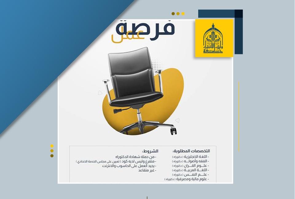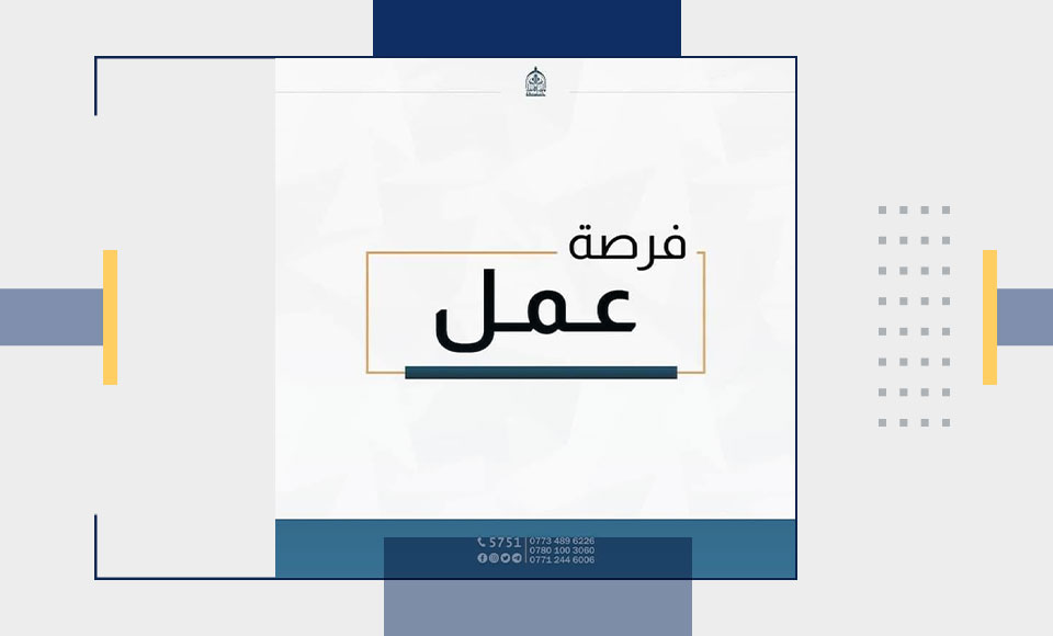 تعلن جامعة وارث الانبياء(عليه السلام)/ كلية الإدارة والإقتصاد عن حاجتها الى درجات وظيفية (متقاعد، أو غير متعين في دوائر الدولة، ولايمتلك كود تعيين على مجلس الخدمة الإتحادي).