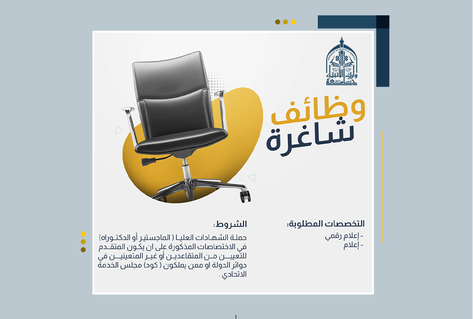 تعلن جامعة وارث الانبياء(عليه السلام)/ كلية الإعلام، عن حاجتها الى درجات وظيفية مطلوب (متقاعدين، أو غير متعين في دوائر الدولة، ولايمتلك "كود" تعيين على مجلس الخدمة الإتحادي).