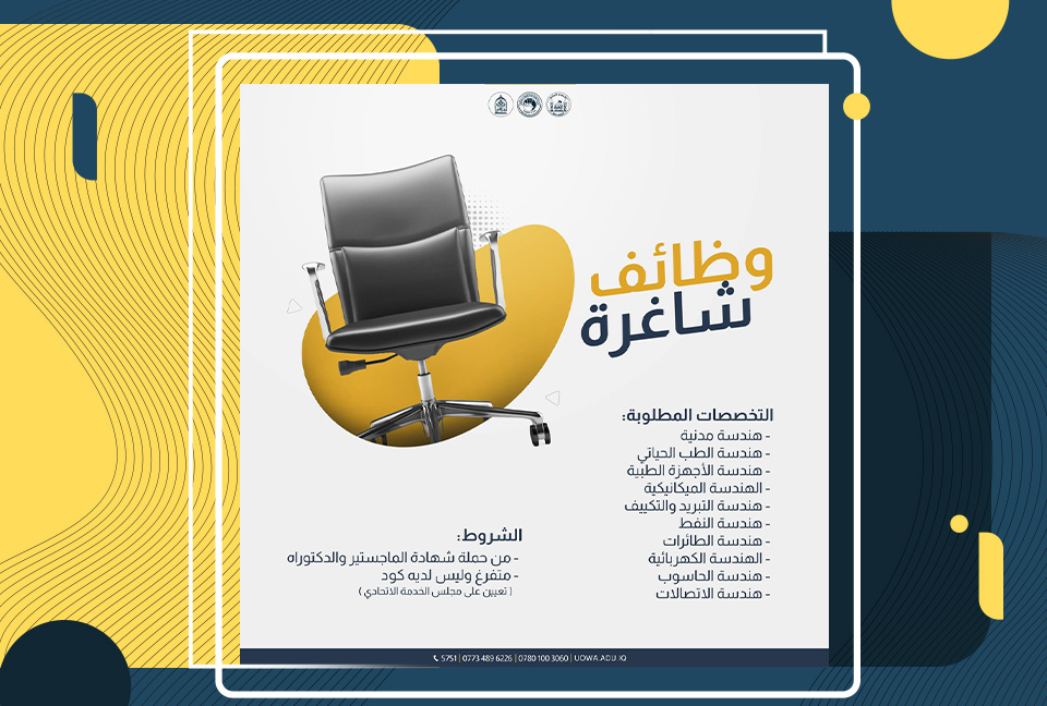 تعلن جامعة وارث الانبياء(عليه السلام)/ كلية الهندسة عن حاجتها الى درجات وظيفية من (متقاعدين، أو غير متعينين في دوائر الدولة)، وذلك لتعزيز فريقها التعليمي وتحقيق رؤيتها المستقبلية.
