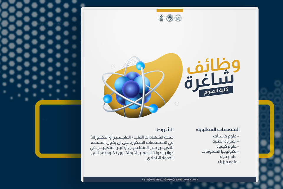تعلن جامعة وارث الانبياء (عليه السلام)/ كلية العلوم عن حاجتها الى درجات وظيفية (متقاعدين، او غير متعين في دوائر الدولة، ولايمتلك كود تعيين على مجلس الخدمة الإتحادي).