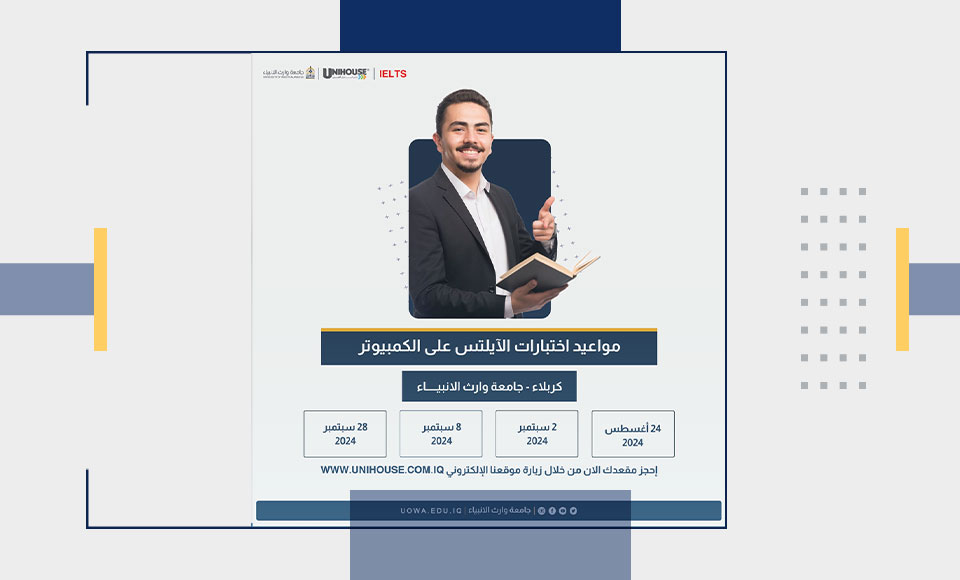 تعلن جامعة وارث الأنبياء (عليه السلام) عن توفر امتحان الآيلتس البريطاني عبر أجهزة الكمبيوتر، مع ميزة إعادة المهارة الواحدة بالتعاون مع منظمة اليونيهاوس المعتمدة لاختبارات الآيلتس الدولي.