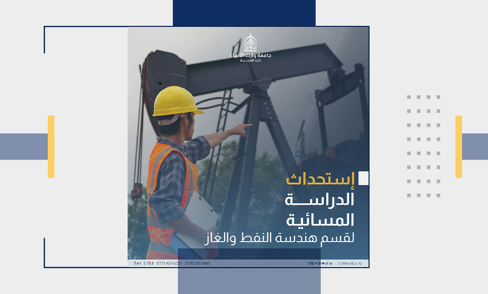أعلنت جامعة وارث الأنبياء (عليه السلام) عن استحداث برنامج الدراسة المسائية في قسم هندسة النفط والغاز بكلية الهندسة. هذا التوسع الجديد يهدف إلى توفير المزيد من الفرص التعليمية للطلاب الراغبين في متابعة دراستهم في هذا المجال الحيوي.