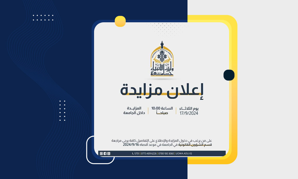 تعلن جامعة وارث الأنبياء (عليه السلام) عن إجراء مزايدة علنية داخل الحرم الجامعي لبيع المواد المستعملة، وذلك لفترة محدودة. للراغبين في الحصول على مزيد من التفاصيل، يرجى مراجعة قسم الشؤون القانونية في الطابق الثاني من بناية العلى بالجامعة.
