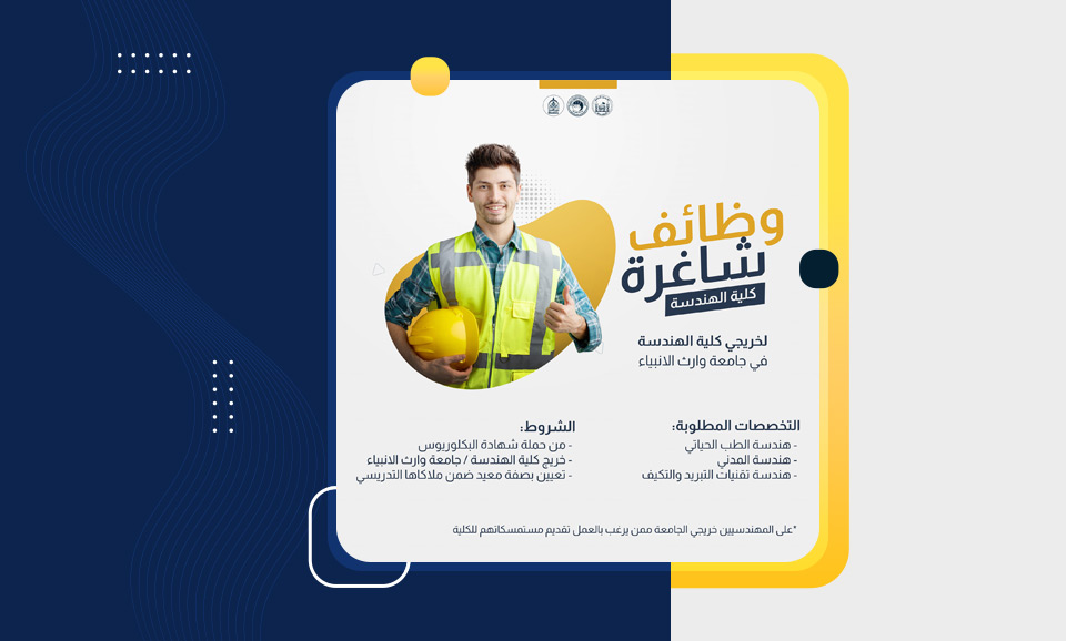 تعلن كلية الهندسة في جامعة وارث الأنبياء (عليه السلام) عن توفر فرص عمل حصرية لحملة شهادة البكالوريوس من خريجي الكلية، للعمل كمعيدين.