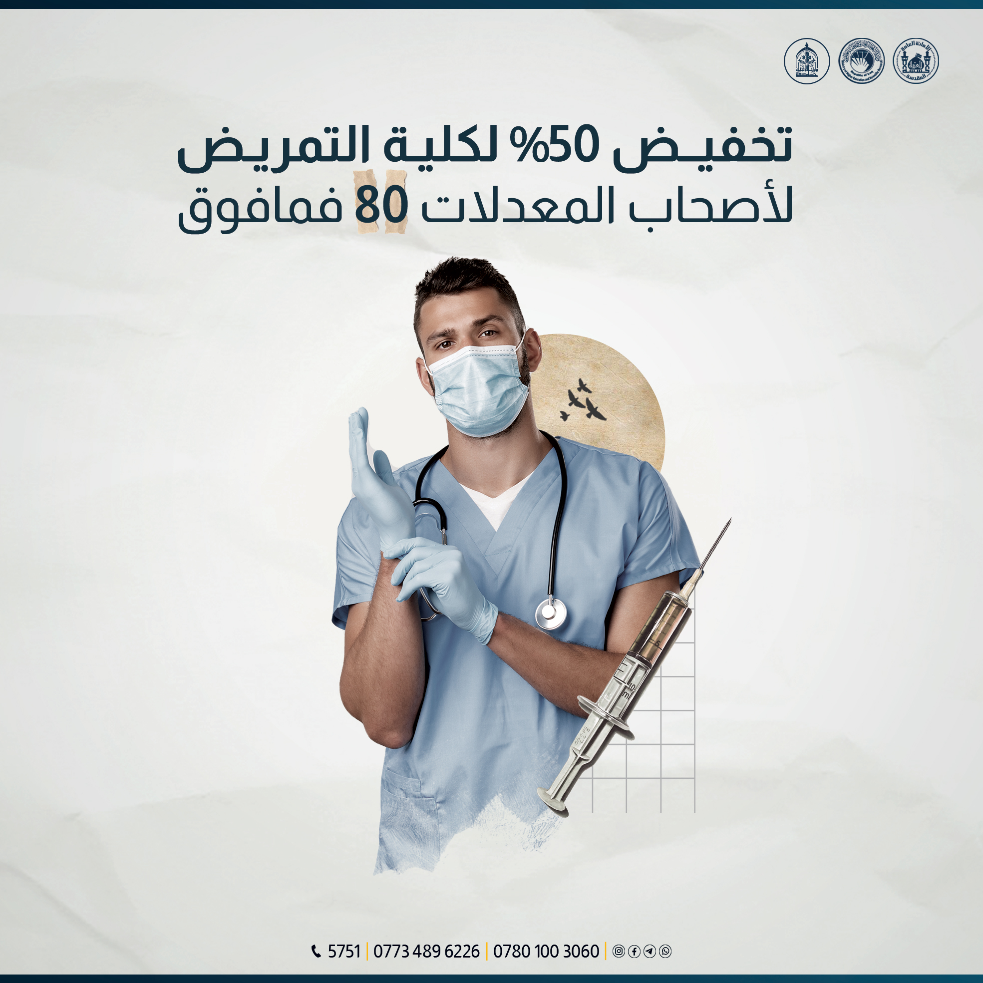 تشجيعاً للطلبة اصحاب المعدلات العالية تعلن رئاسة جامعة وارث الانبياء(عليه السلام) عن تخفيض_الأجور الدراسية للطلبة المتقدمين للدراسة في كلية التمريض بنسبة 50% للمعدلات من 80 فما فوق.