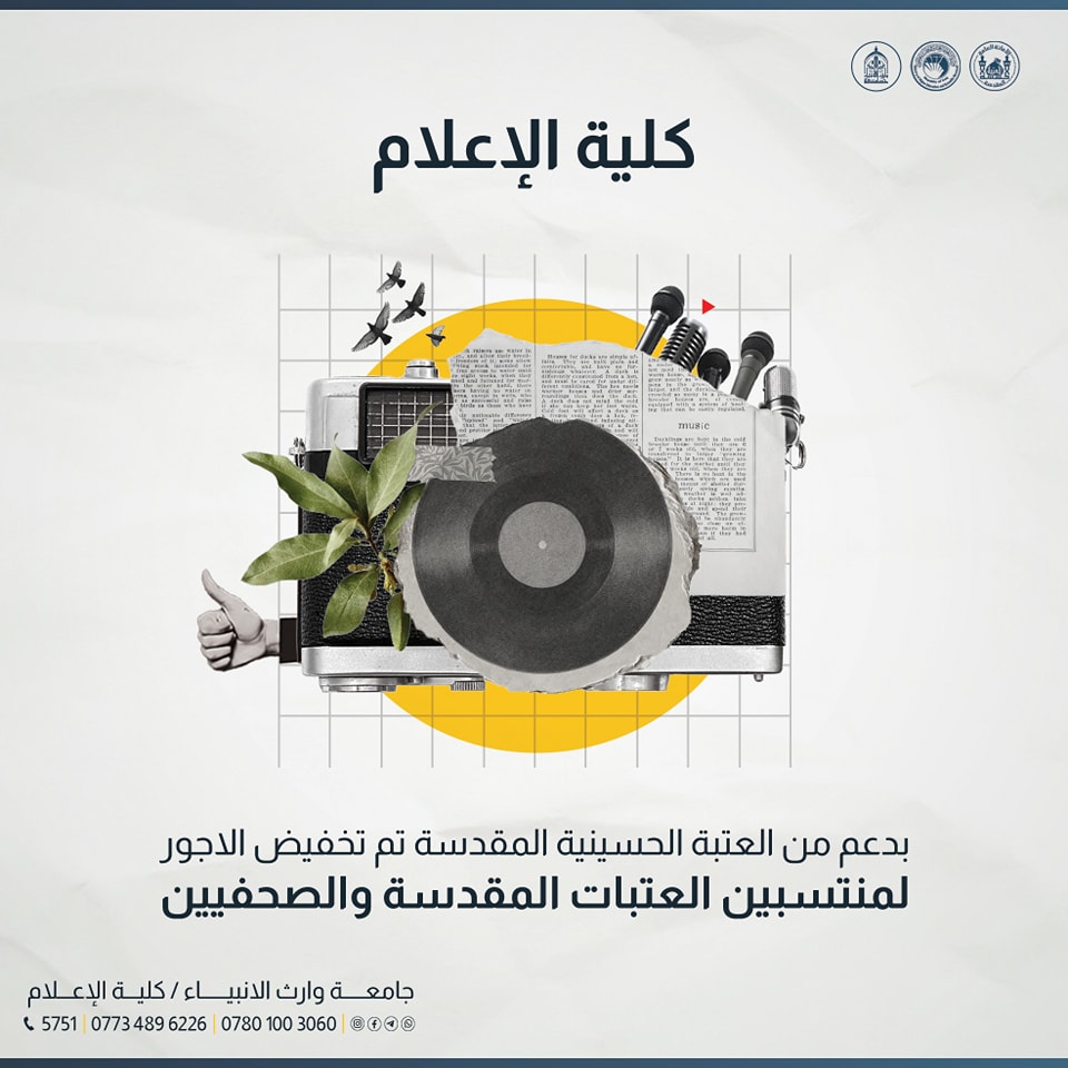 جامعة وارث الانبياء(عليه السلام) وبدعم من العتبة الحسينية المقدسة تقدم مجموعة من التخفيضات الخاصة  لمنتسبي العتبات المقدسة والصحفيين الراغبين بالتقديم على كلية الإعلام بقسميها الإعلام الرقمي،والعلاقات العامة.