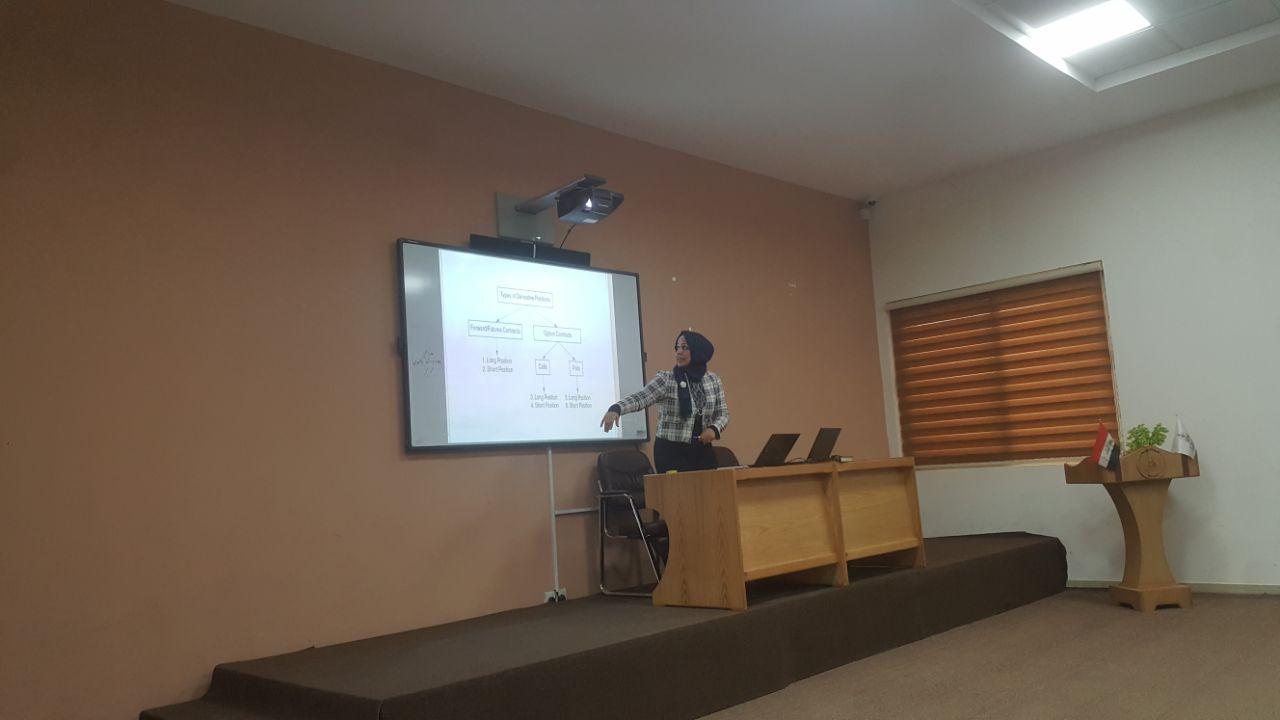 أقام قسم ادارة الاعمال في كلية الادارة والاقتصاد حلقة نقاشية بعنوان (المشتقات المالية) قام بألقائها الاستاذ (م.د هبة الله مصطفى) يوم الاربعاء المصادف 2\1\2019وقد حضر الجلسة كل من سيادة عميد الكلية أ.د.عامر العطوي و رئيس قسم المحاسبة م.د.فهد الشمري والسادة التدريسيين وقد ركزت الورشة على توضيح مفهوم المشتقات المالية وطريقة انشائها وكيفية توظيفها لخدمة الجانب التعليمي لطلبة كليتنا