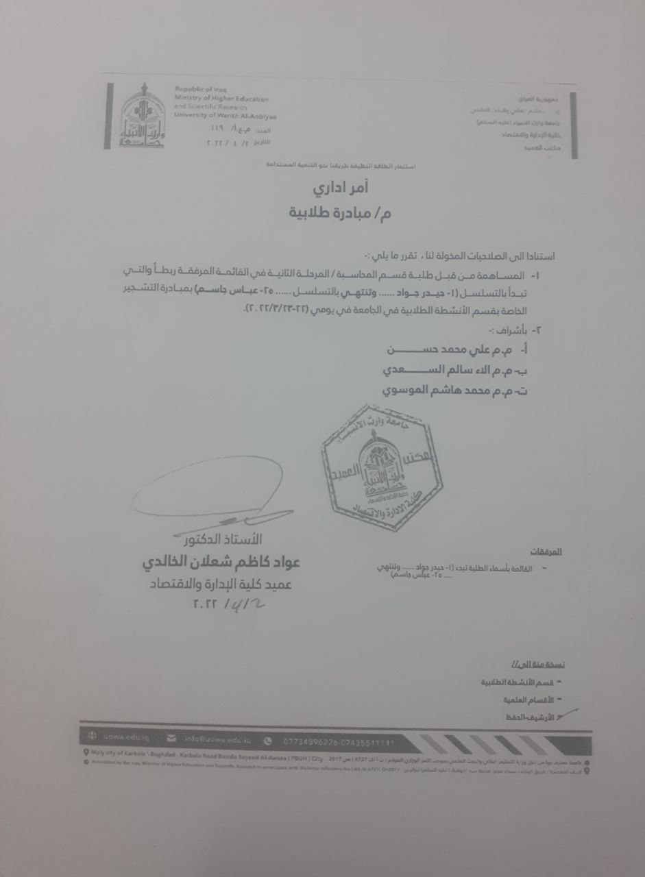 ساهم مجموعة من طلبة كلية الادارة والاقتصاد قسم المحاسبة في جامعة وارث الانبياء في مبادرة التشجير الخاصة بالانشطة الطلابية
