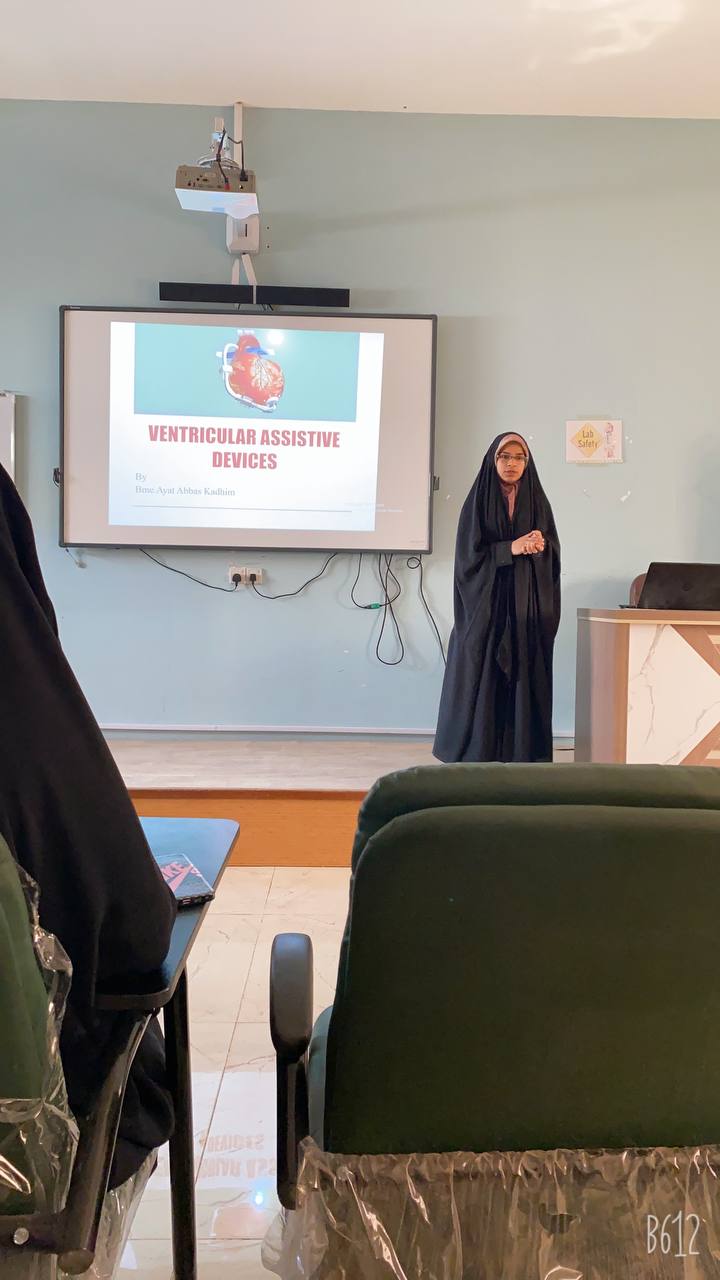 أقام قسم هندسة الطب الحياتي حلقة نقاشية بعنوان (Ventricular assistive devices أجهزة الدعم البطينية) حاضرت فيها المهندسة آيات عباس كاظم بحضور رئيس القسم والسادة التدريسيين والمهندسين حيث تضمنت الحلقة التعرف على فسلجة وتشريح القلب والأوعية الدموية و ربط الجانب الطبي بالجانب الهندسي لجريان الدَّم خلال الأوعية ومن ثم الانتقال إلى أنواع الأمراض التي يتعرض لها القلب و الأجهزة الطبية المرتبطة بكل مرض و التي من ضمنها أجهزة المساعدة البطينة المتخصصة بتعزيز وظيفة البطين الأيسر او الأيمن او كلاهما والمساهمة في ضخ كَمّيَّة الدَّم الذي يحتاجها الجسم.