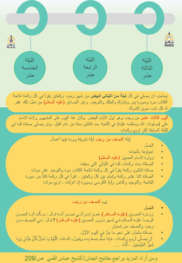 زيارة الحسين(عليه السلام)، فعن ابن أبي نصر أنه قال : سأَلت أبا الحسن الرضا عليه السلام في شهر نزور الحسين (عليه السلام ) ؟ قال : في النصف من رجب والنصف من شعبان .