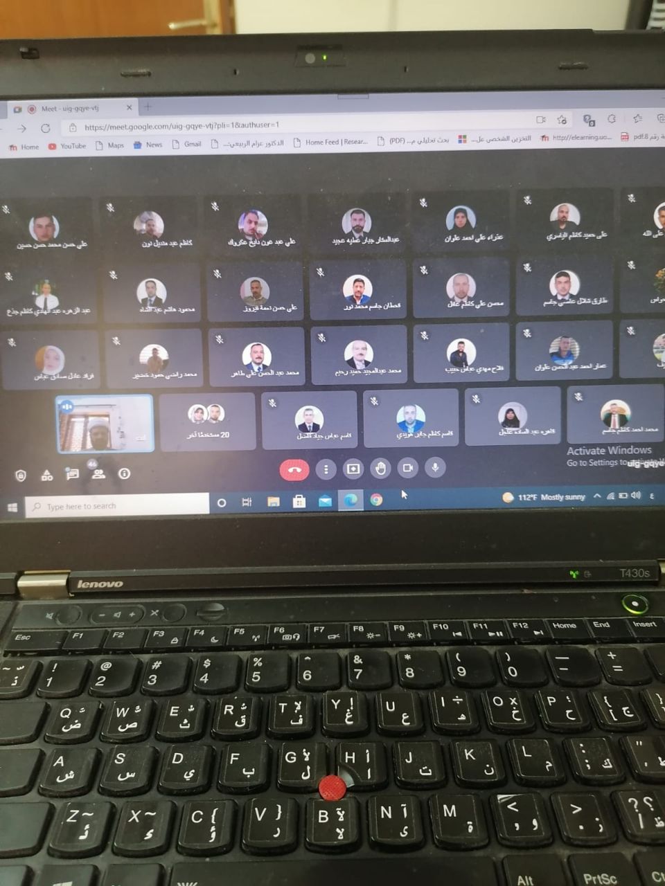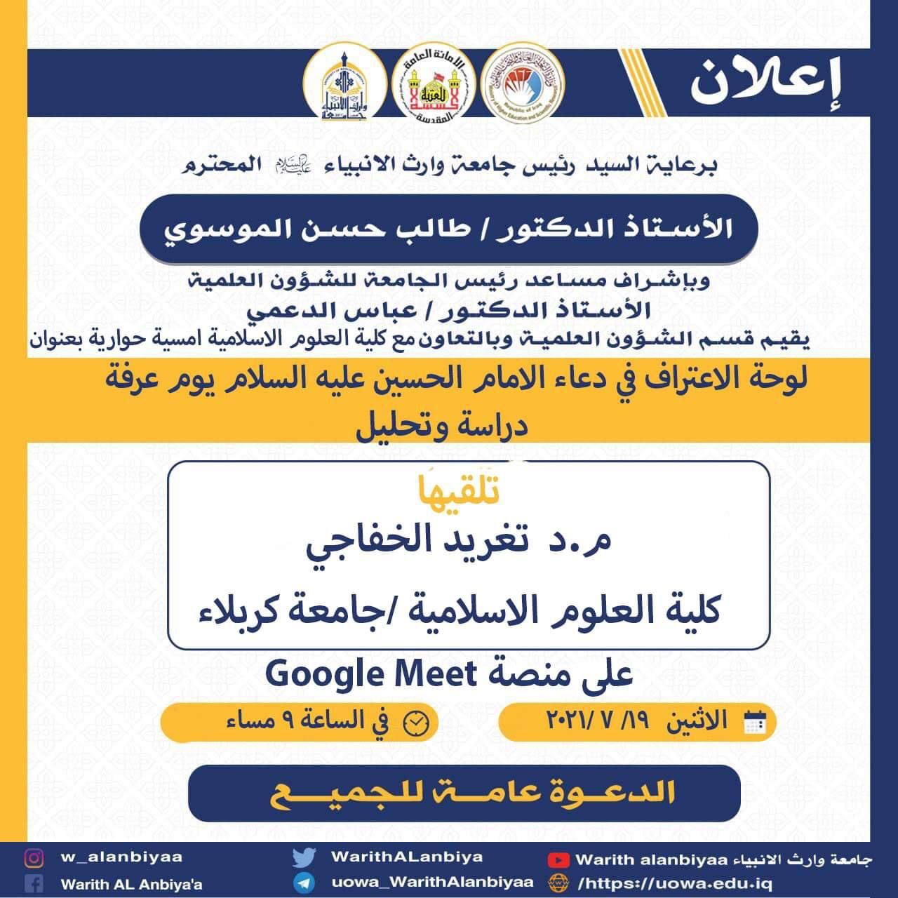 ندوة علمية بعنوان ( شبهات حول القرآن الكريم) يلقيها الدكتور نجاح حسين الحسناوي وبادارة م. م. ياسمين سلمان الطرفي في تمام الساعة الثامنة والنصف مساء من يوم السبت الموافق ٧ / ٨ /٢٠٢١ عبر منصة التعليم الإلكتروني الكوكل ميت