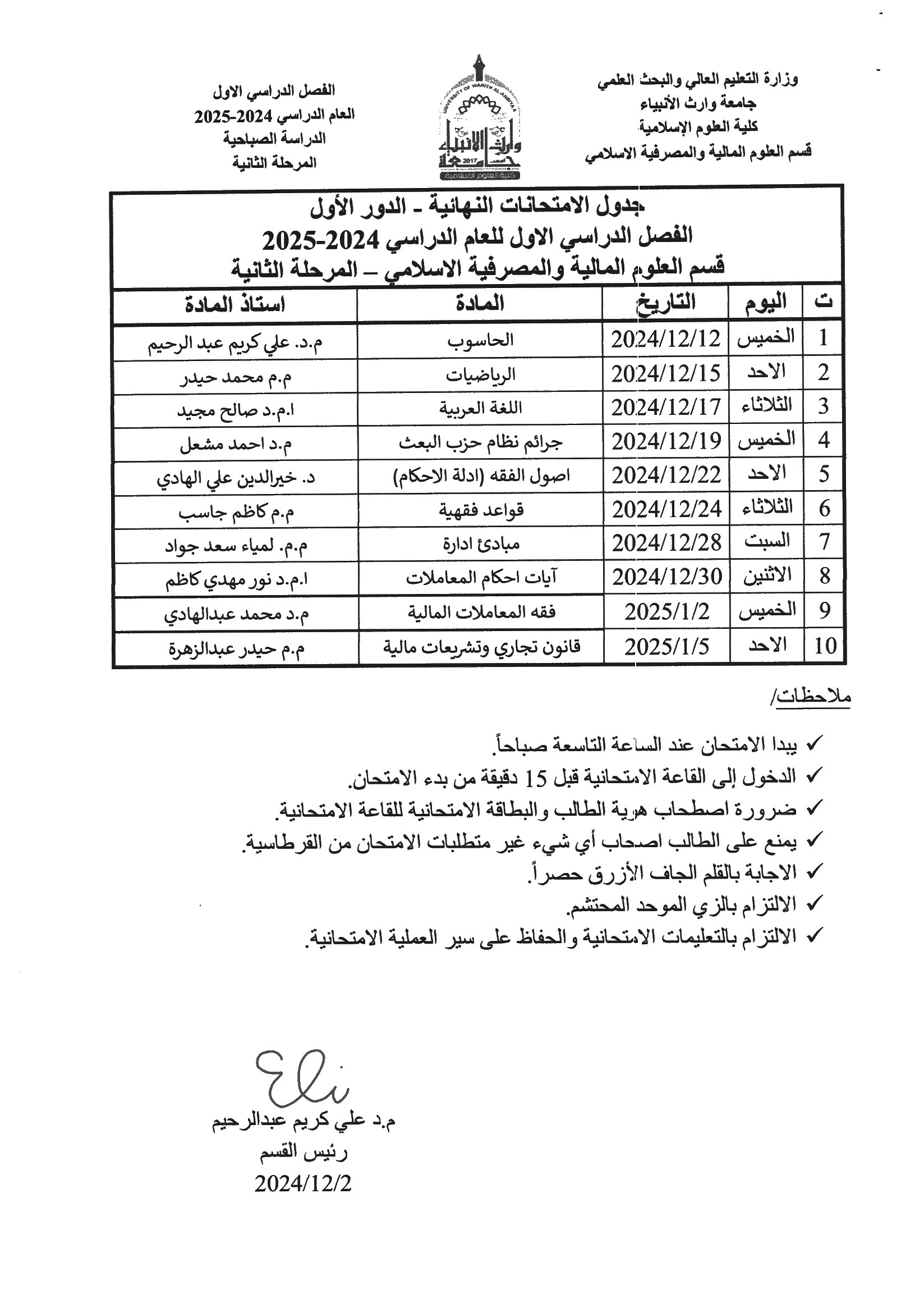 جدول امتحانات الكورس الأول قسم العلوم المالية والمصرفية الاسلامي تعلن كلية العلوم الإسلامية في جامعة وارث الأنبياء (عليه السلام) عن انطلاق امتحانات الكورس الأول للعام الدراسي 2024-2025، وذلك ابتداءً من يوم السبت الموافق 14 ديسمبر 2024. وتتمنى عمادة الكلية لجميع الطلبة التوفيق والنجاح في أداء امتحاناتهم، مع التأكيد على الالتزام بالتعليمات الامتحانية والحضور في المواعيد المحددة لكل مادة. كما تدعو الكلية الطلبة إلى الاستعداد الجيد ومراجعة المواد الدراسية لتحقيق أفضل النتائج. ملاحظات مهمة للطلبة: - يرجى التواجد في القاعات الامتحانية قبل بدء الامتحان بوقت كافٍ. - الالتزام بإحضار الهوية الجامعية وباقي المستلزمات المطلوبة. - يُمنع استخدام الأجهزة الإلكترونية أو أي وسائل غير مسموح بها أثناء الامتحان. كل التوفيق والنجاح لطلبتنا الأعزاء!