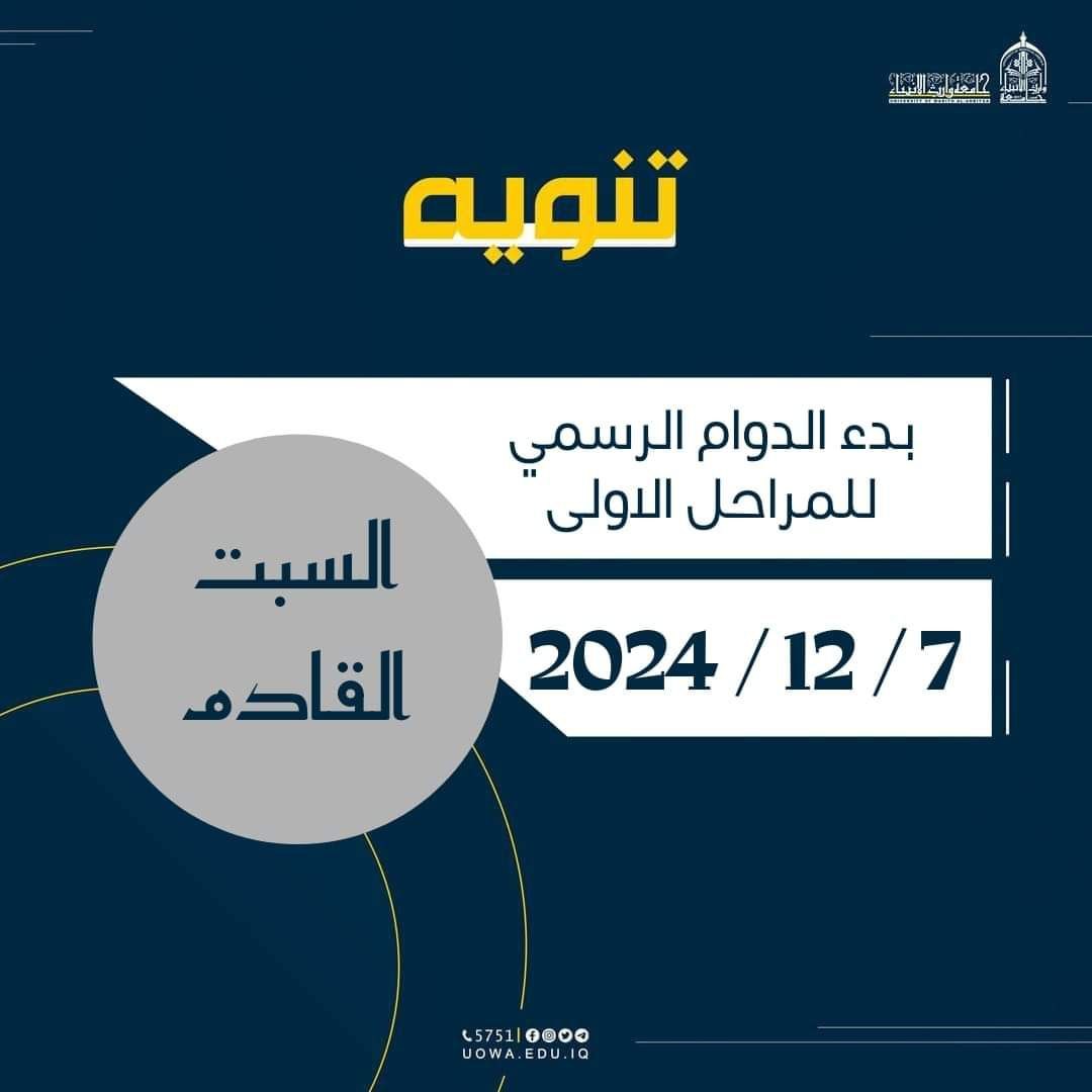 تعلن كلية العلوم الإسلامية في جامعة وارث الأنبياء (عليه السلام) عن اسماء الطلبة المقبولين في كلية العلوم الاسلامية قسم الفقه وأصوله كما تنوه الكلية عن موعد بدء الدراسة لطلاب المرحلة الأولى، حيث سيكون انطلاق العام الدراسي الجديد يوم السبت الموافق 7 ديسمبر 2024.ندعو جميع الطلبة الأعزاء إلى الحضور في القاعات الدراسية تمام الساعة 8:30 صباحًا، والساعة 2:00 للدراسة المسائية حيث سيتم استقبالهم والترحيب بهم من قبل عمادة الكلية والهيئة التدريسية.نتمنى لجميع الطلبة عامًا دراسيًا موفقًا ومليئًا بالنجاح والتميز.