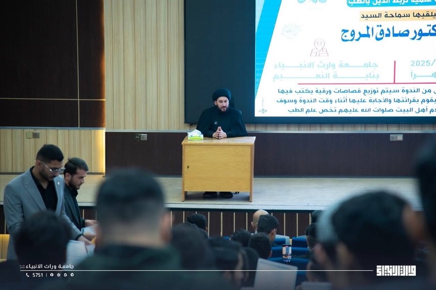 برعاية الأمانة العامة للعتبة الحسينية المقدسة، نظّمت كلية الطب في جامعة وارث الأنبياء ندوة علمية بعنوان "ارتباط الدين بالطب" قدّمها السيد الدكتور صادق المروج، بحضور جمع من طلبة الكلية وأساتذتها.وتناولت الندوة محاور عدّة، أبرزها كيفية ربط القرآن الكريم بالعلم، وبيان تأثير القرآن على طالب العلم في الجانبين الأخلاقي والمعرفي، إضافة إلى بحث العلاقة بين التعاليم الدينية والمفاهيم الطبية الحديثة.وفي مستهل الندوة، جُمعت أسئلة الحضور عبر قصاصات ورقية ليتم الإجابة عنها أثناء الجلسة، كما شهدت الفعالية توزيع أحاديث من كلام أهل البيت عليهم السلام مرتبطة بالطب، بهدف تعزيز البعد القيمي والإنساني في الممارسة الطبية.