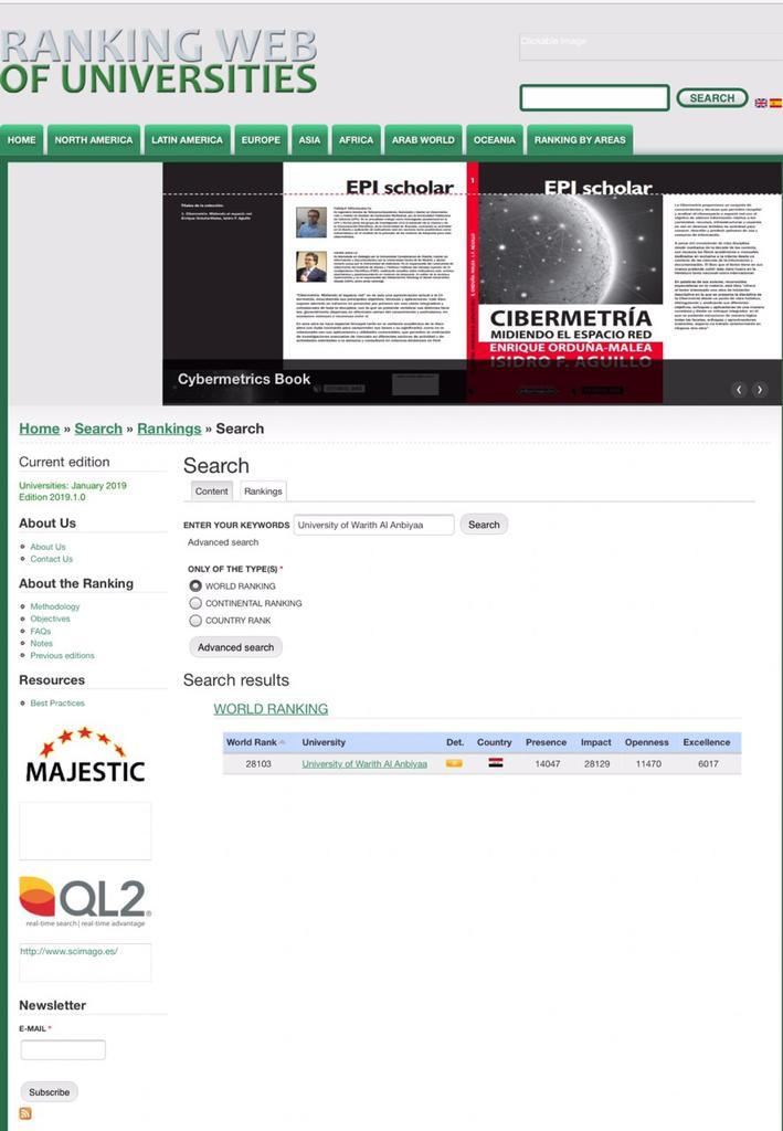دخلت جامعة وارث الانبياء التابعة الى الامانة العامة للعتبة الحسينية المقدسة ضمن التصنيف العالمي الاسباني للجامعات على الرغم من عمرها الفتي الذي لا يتجاوز السنتين حيث تأسست في عام 2017م .