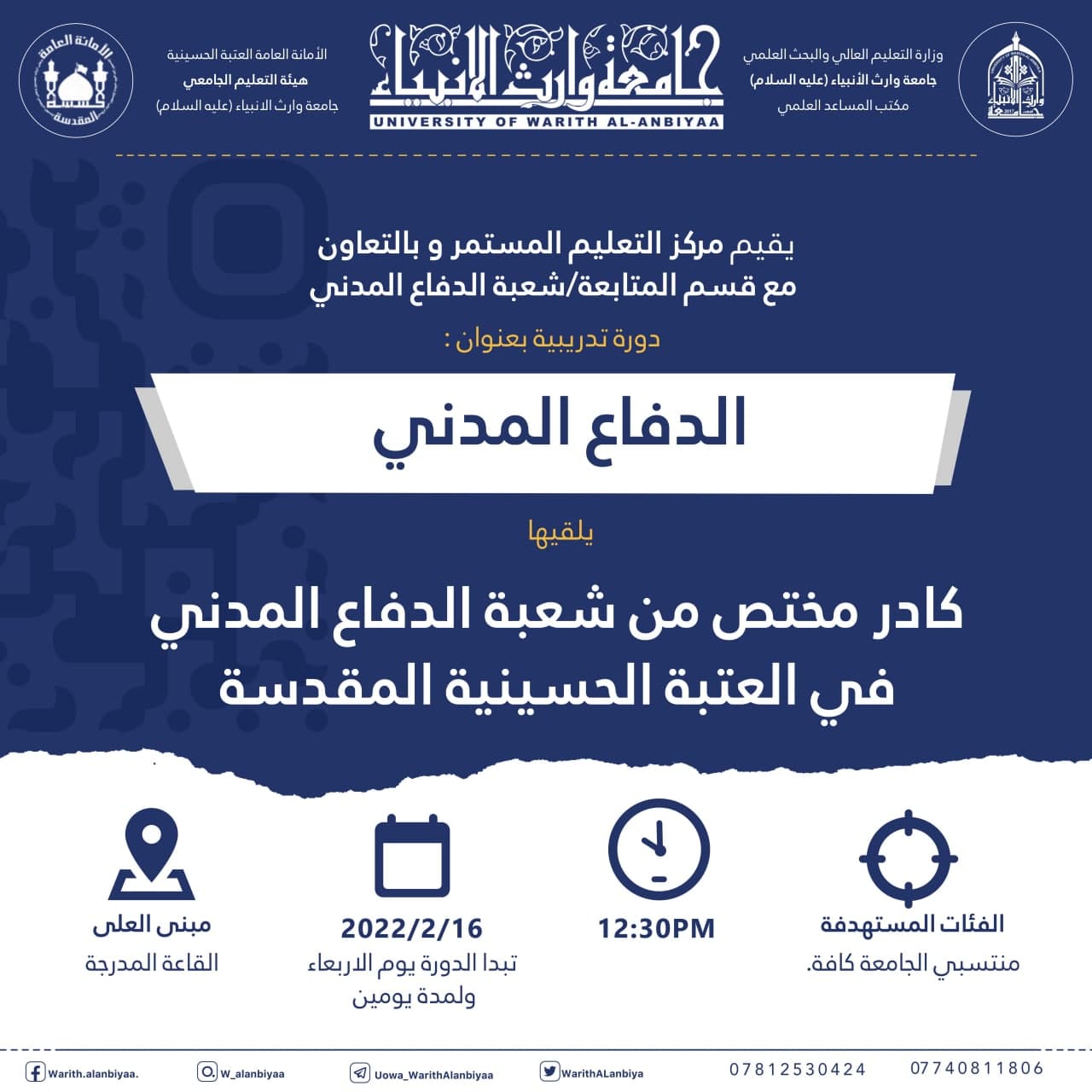 يقيم قسم التعليم المستمر وبالتعاون مع قسم المتابعة/ شعبة الدفاع المدني، دورة تدريبية بعنوان "الدفاع المدني" لمنتسبي الجامعة يلقيها كادر مختص من شعبة الدفاع المدني في العتبة الحسينية المقدسة وذلك يوم الاربعاء 16-2-2022، على القاعة المدرجة في بناية العلا، في الساعة 12:30 ظهراً. علماً أن الورشة تستمر لمدة يومان.