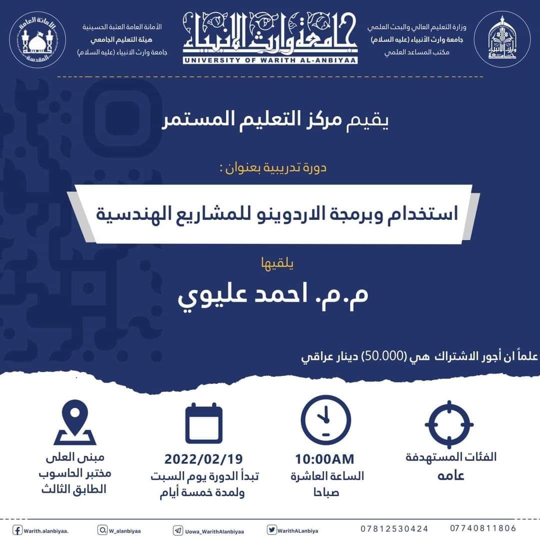 يهديكم مركز التعليم المستمر في جامعة وارث الأنبياء (عليه السلام) اطيب التحيات ، نود اعلامكم عن اقامة المركز دورة تدريبية بعنوان (استخدام وبرمجة الاردوينو للمشاريع الهندسية) والتي تعقد ابتداءً من يوم السبت الموافق 19/2/2022 ولمدة خمسة أيام. تلقى الدورة حضورياً في بناية العلى/مختبر الحاسوب/ الطابق الثالث في تمام الساعة (10:00) صباحاً. يحاضر في الدورة المتخصص في مجال هندسة الحاسبات المهندس (م.م. احمد عليوي).تستهدف الدورة طلبة كلية الهندسة والراغبين في تطوير مهاراتهم في استخدام وبرمجة الاردوينو.للاشتراك في الدورة يرجى زيارة الرابط التالي ( https://bit.ly/3pQ2Zgk ).علماً ان أجور الاشتراك هي (50,000) دينار عراقي ( خمسون الف دينار عراقي).