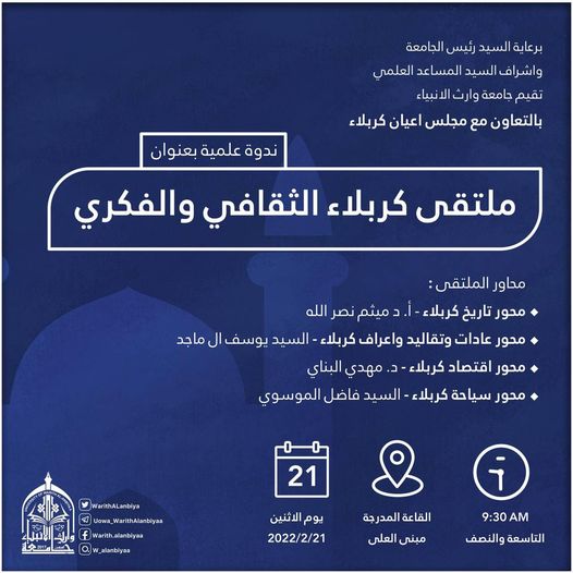 تزامنا مع ذكرى ولادة امير المؤمنين الامام علي (عليه السلام) نضم مركز التعليم المستمر في جامعة وارث الانبياء (عليه السلام) بالتعاون مع كلية القانون اليوم الاول من دورة "فن الادارة عند امير المؤمنين (عليه السلام)" والتي حاضر فيها من كلية القانون الدكتور احمد الصفار.علما ان الدورة تستمر ليومي الاثنين والثلاثاء الموافق 2022/2/15,14 على قاعة الامام الحسين (عليه السلام)/ كلية القانون في تمام الساعة العاشرة صباحا ولجميع الراغبين في الحضور.
