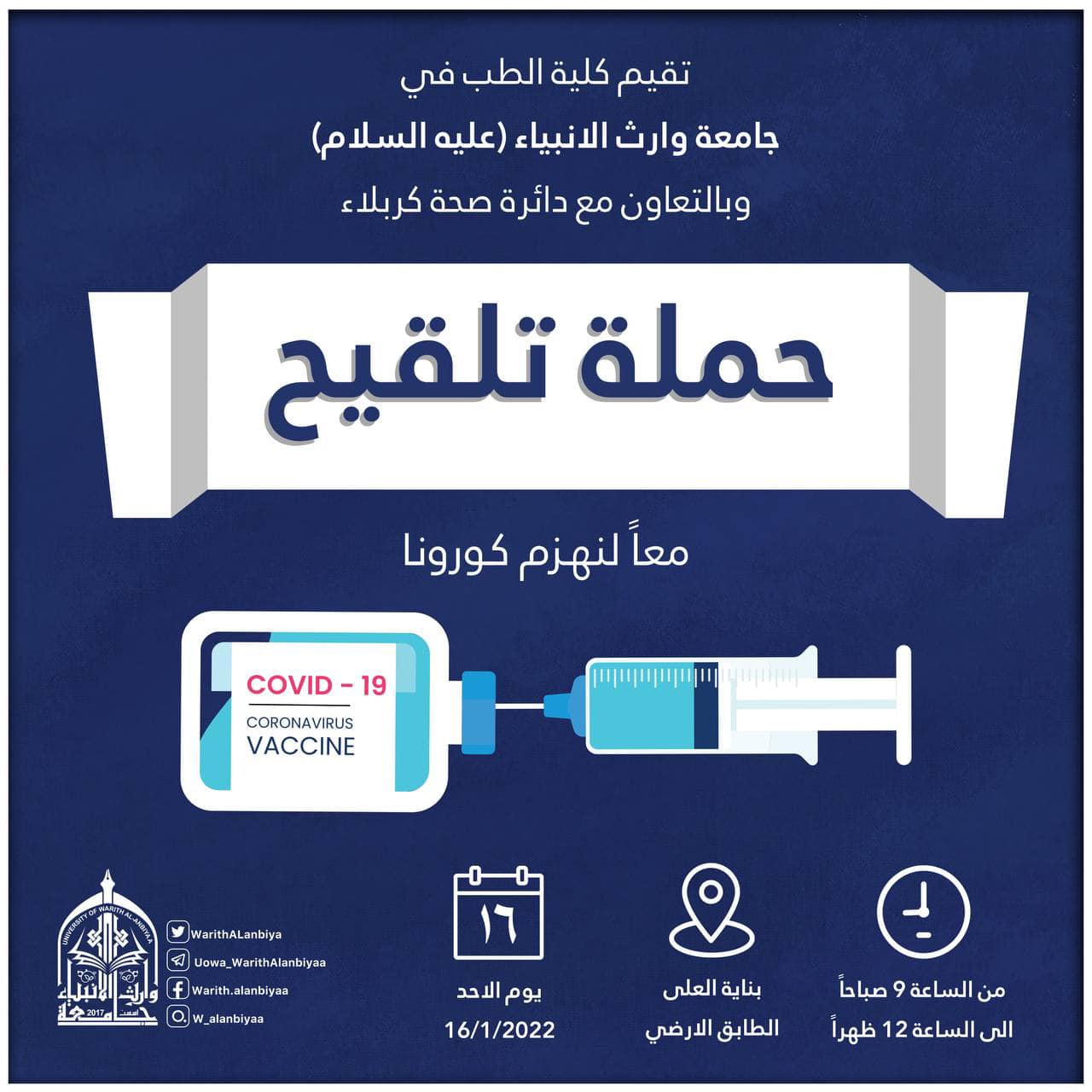 بناءً على توجيهات وزارة التعليم العالي والبحث العلمي ووزارة الصحة العراقية ،، نظمت كلية الطب ،وبالتعاون مع دائرة صحة كربلاء المقدسة حملة تطعيم ضد فايروس كورونا COVID-19 للملاكات التدريسية والوظيفية والطلبة وجاءت هذه الحملة لحث الكوادر التدريسية والطلبة على اخذ اللقاح للحد من تفشي الوباء وحفاضاً على سلامة الجميع.