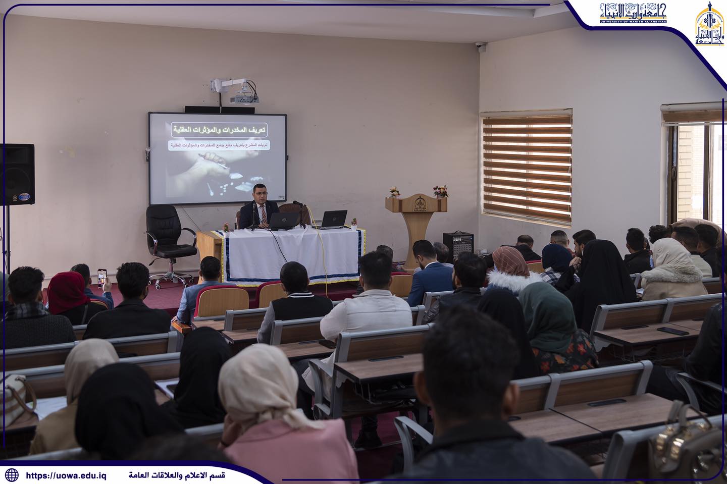 برعاية السيد رئيس الجامعة الاستاذ الدكتور ابراهيم سعيد الحياوي اقامت كليةالتمريض وكلية القانون وبالتعاون مع مديرية مكافحة مخدرات كربلاء ندوة علمية عن المخدرات والرؤية القانونية / الطبية والانسانية تناولت فيها ظاهرة المخدرات وآثارها القانونية و الصحية والاجتماعية ، حيث سلطت الندوة الضوء على هذه الظاهرة السلبية واثارها على الفرد والعائلة والمجتمع ، وتناولت أيضاً أضرار المخدرات وما ينتج عنها من تأثيرات آنية ومستقبلية على الفرد والمجتمع ، إضافة الى العقوبات التي وضعها المشرِّع العراقي من قانون المخدرات والمؤثرات العقلية ، كذلك التأكيد على المسؤولية الملقاة على الجميع في مجابهة تلك الآفة الخطيرة والحد من انتشارها ، شارك بتقديم هذه الندوة العقيد الحقوقي جبار فضل سكر مدير مكافحة المخدرات في قيادة شرطة كربلاء والدكتور صباح الجبوري من كلية القانون.