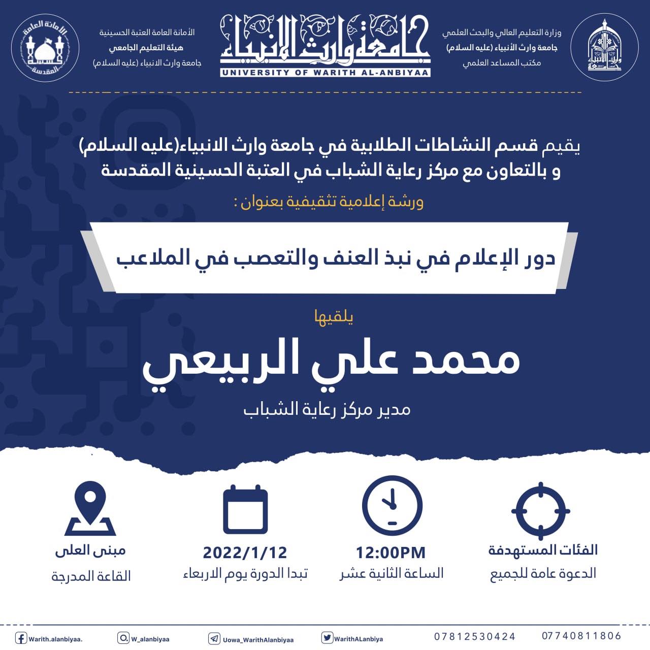 يقيم مركز التعليم المستمر في جامعة وارث الانبياء (عليه السلام) بالتعاون مع كلية الادارة والاقتصاد حلقة نقاشية بعنوان "التعلم عن بعد"، يلقيها ... أ.د عواد كاظم شعلان الخالدي يوم السبت الموافق 1/8/ 2022. وتقام حضورياً على احدى القاعات الدراسية في بناية العُلا وفي تمام الساعة 11:00 صباحاً.لاعضاء الهيئات التدريسية في كليات الجامعة