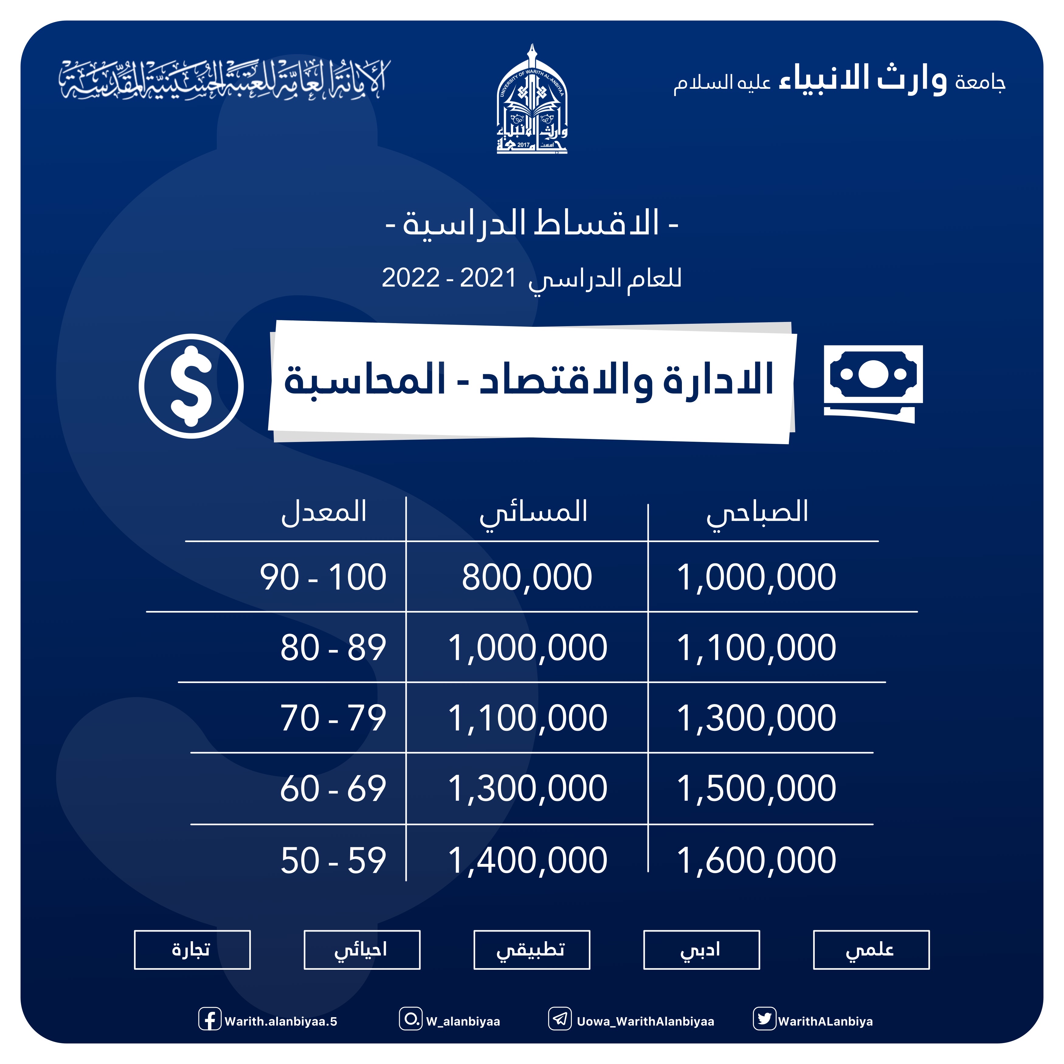 الاجور الدراسية ومعدلات القبول في جامعة وارث الأنبياء (عليه السلام)