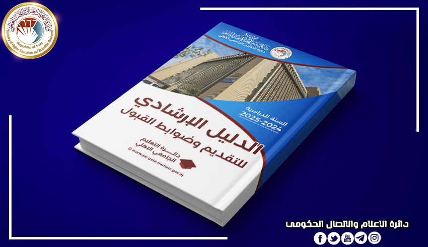 إطلاق الدليل الإرشادي لضوابط التقديم الإلكتروني المركزي إلى الجامعات والكليات الأهليةتعلن وزارة التعليم العالي والبحث العلمي إطلاق الدليل الإرشادي لضوابط التقديم إلى الجامعات والكليات الأهلية للعام 2025/2024.ويتضمن الدليل الأسس العامة التي يعتمده نظام التقديم والقبول الإلكتروني المركزي وشروط وضوابط التقديم إلى الدراسة الصباحية والمسائية وضوابط القنوات الأخرى والمنحة المجانية الخاصة بالمجموعة الطبية والحدود الدنيا للتقديم بحسب التخصصات إلى الجامعات والكليات الأهلية ومدخلات القبول لكل قسم وآلية التقديم عن طريق التطبيق الخاص بدائرة التعليم الجامعي الأهلي وخطوات إنشاء الحساب وملء البيانات.ونلفت عناية المهتمين بشؤون التعليم الجامعي إلى أن التقديم الإلكتروني المركزي إلى الجامعات والكليات الأهلية ودليلها سيكون متاحا في الأسبوع المقبل.الدليل الارشادي👇:https://mohesr.gov.iq/ar/assets/img/uploaded_files/22_10_2024.pdf