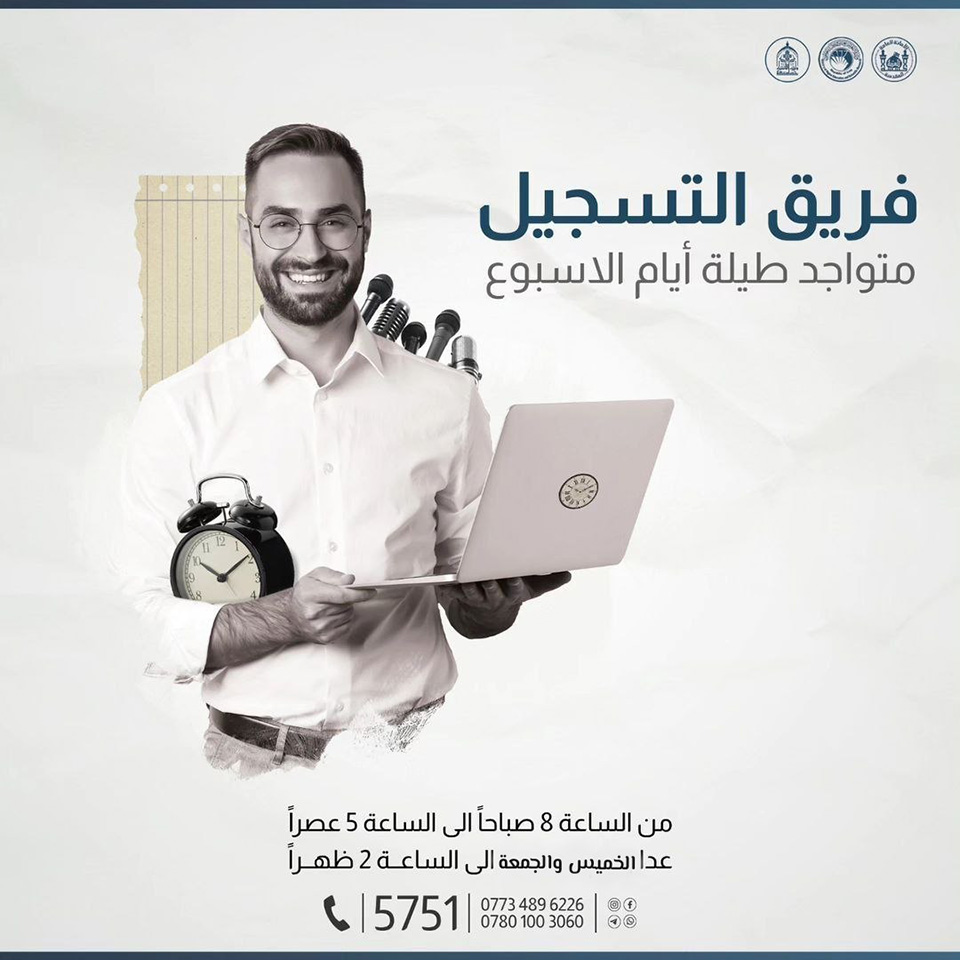 *نود اعلامكم بأن فريق التسجيل متواجد طيلة ايام الاسبوع من الساعة 8:00 صباحاً ولغاية الساعة 5:00 مساءً