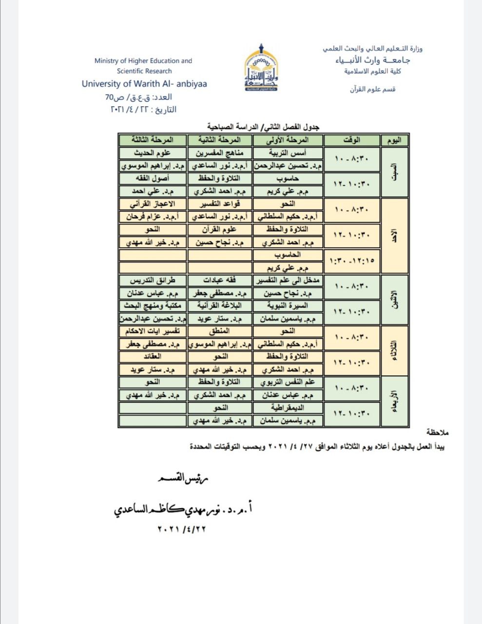 جدول الدروس الأسبوعي لقسم علوم القرآن الدراسة المسائية