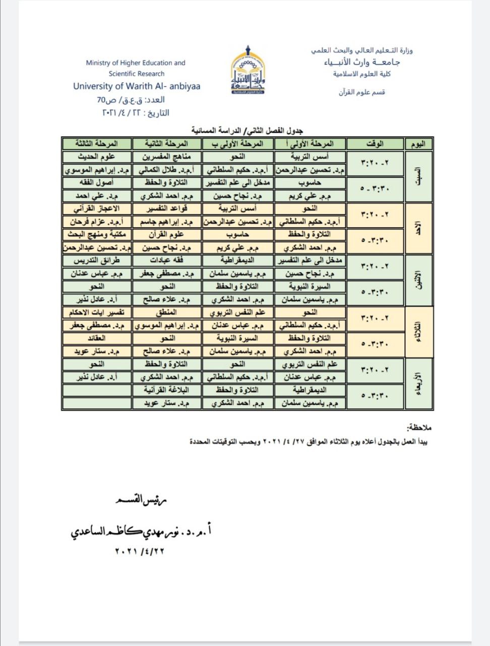 جدول الدروس الأسبوعي لقسم علوم القرآن / للمراحل الثلاث الدراسة المسائية