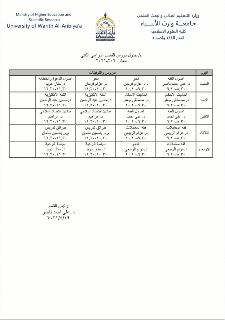 جدول الدروس الأسبوعي لقسم الفقه واصوله