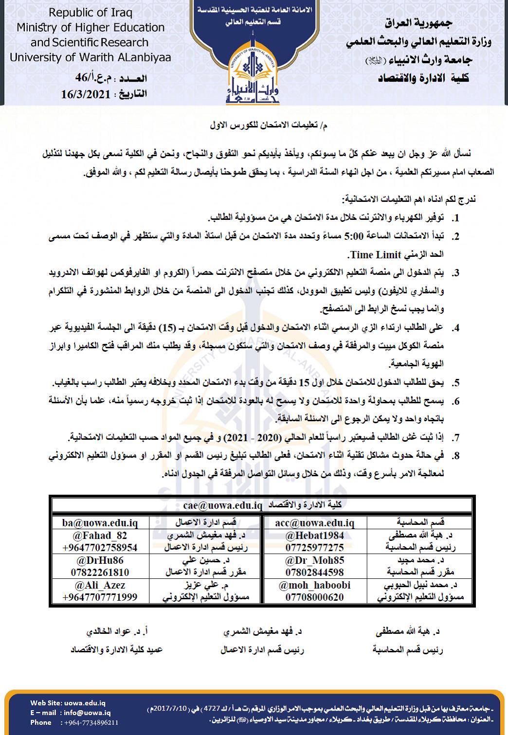 بإشراف مباشر من السيد عميد كلية الادارة والاقتصاد "أ.د.عوادالخالدي" والسادة رؤساء الاقسام (م.د.فهد الشمري/ رئيس قسم ادارة الاعمال و م.د.هبة الله مصطفى/ رئيس قسم المحاسبة)،تم إجراء امتحانات الكورس الاول للعام الدراسي 2020-2021.
