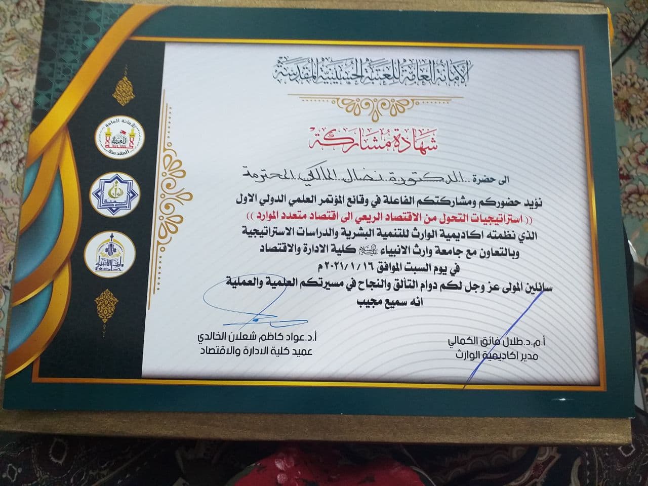 الدكتورة "نضال المالكي" لجهودها المتميزة في دعم المسيرة العلمية في الكلية