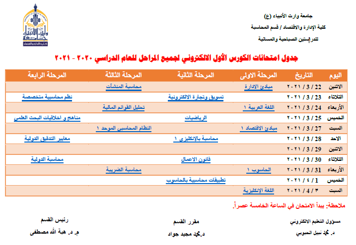 جدول المراقبين للامتحانات الالكترونية لقسم المحاسبة للكورس الدراسي الاول للعام 2020-2021