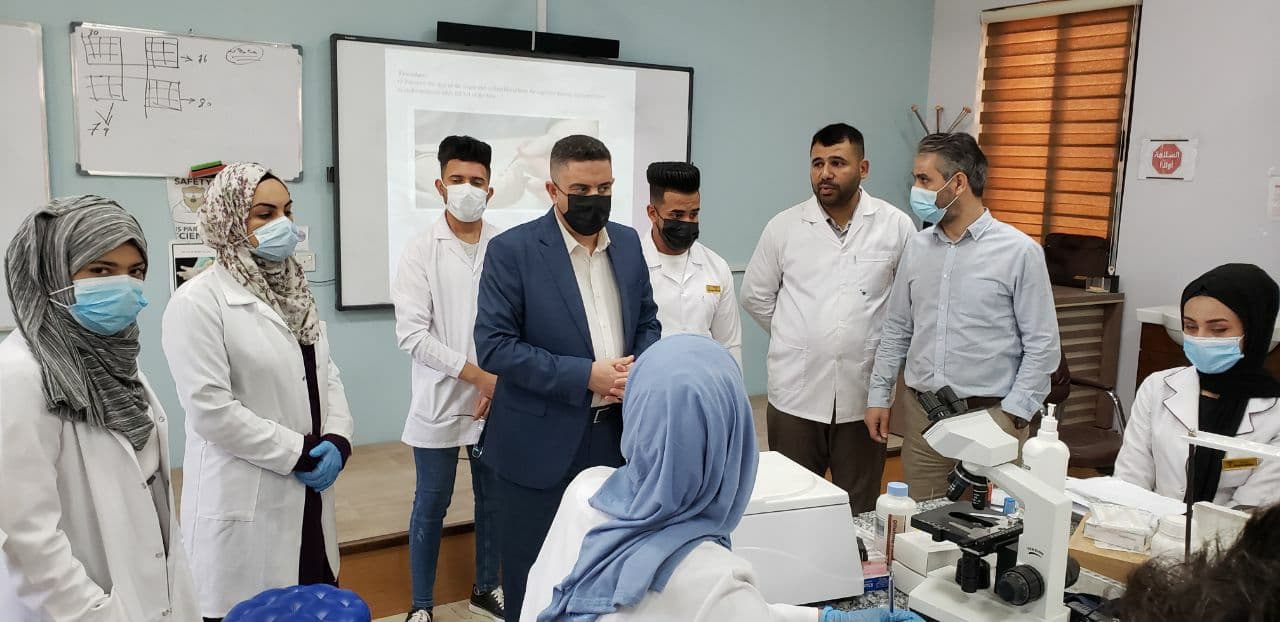 تفقد السيد عميد كلية التمريض المحترم ( أ.م.د. مرتضى غانم عداي ) سير العملية التعليمية للفصل الدراسي الثاني داخل المختبرات العلمية حيث اكد جنابه على ضروره الالتزام بالارشادات والتعليمات الوقائية الصحية اللازمة.من جانب اخر يواصل تدريسيو الكلية تدريب الطلبة للمواد العملية الاساسية والذي جاء حسب توجيهات الوزارة بضرورة اعتبار التعليم المدمج كوسيلة لإيصال المنهج العلمي في الوضع الراهن لطلبتنا الاعزاء.