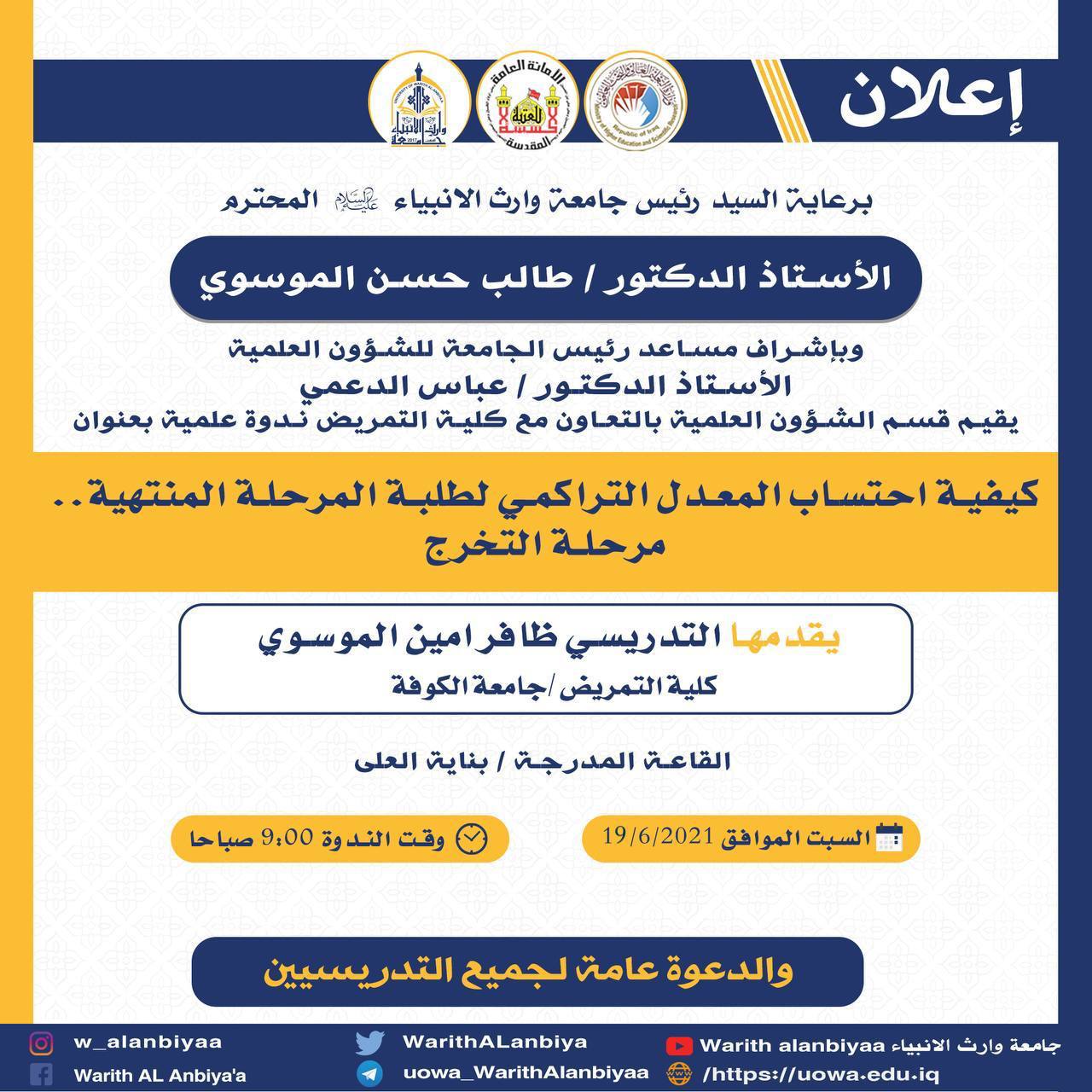 برعاية السيد رئيس الجامعة المحترم وبأشراف السيد مساعد رئيس الجامعة للشؤون العلمية المحترم اقام قسم الشؤون العلمية في جامعة وارث الانبياء ع وبالتعاون مع كلية التمريض ندوة علمية بعنوان كيفية احتساب المعدل التراكمي لطلبة المراحل المنتهية القاها التدريسي في كلية التمريض/ جامعة الكوفة المدرس ظافر امين الموسوي وكانت الندوة بحضور السيد رئيس قسم الشؤون العلمية الاستاذ الدكتور حاكم سماوي والسيد عميد كلية التمريض الاستاذ المساعد الدكتور مرتضى غانم الجبوري وعدد من السادة العمداء واعضاء اللجان الامتحانية ولجان احتساب المعدل التراكمي.