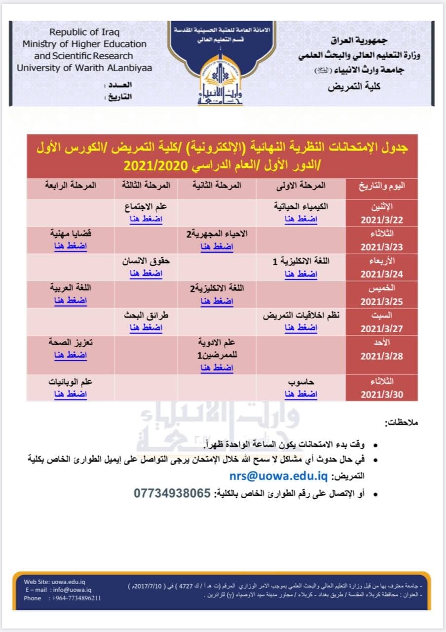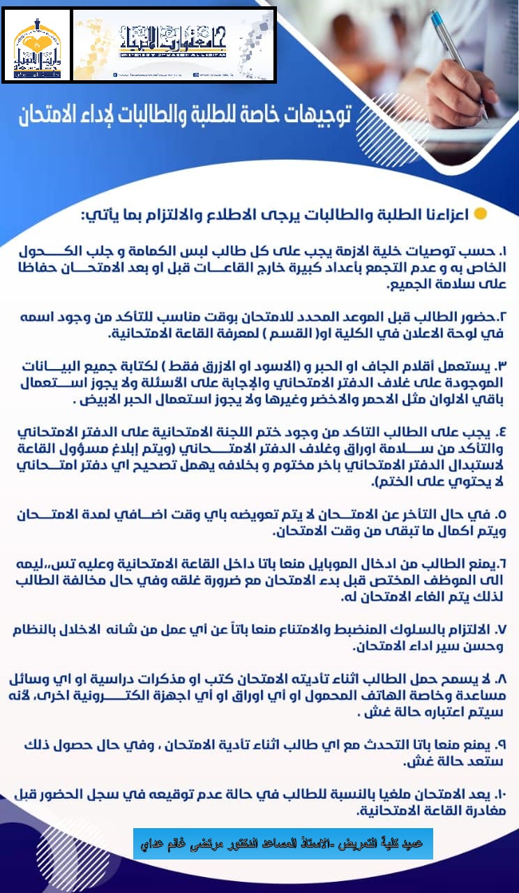 استمرار اختبار الطلبة في اسبوع الامتحانات النهائية العملية للمواد الاساسية في كلية التمريض مع اتخاذ كافة الاجراءات الوقائية اللازمة.