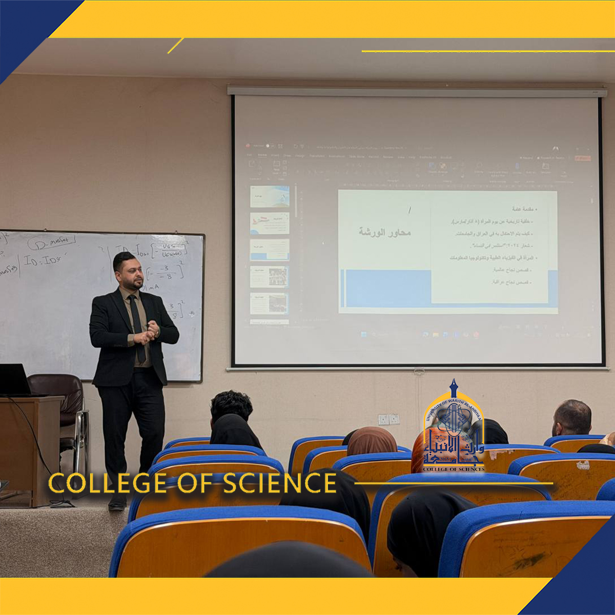 أقامت كلية العلوم في جامعة وارث الأنبياء عليه السلام ورشة توعوية بعنوان يوم المرأة: تمكين المرأة في العلوم والتكنولوجيا، قدّمها التدريسي م.م كرار صادق محسن بحضور مجموعة من الطلبة وأعضاء هيئة التدريس.