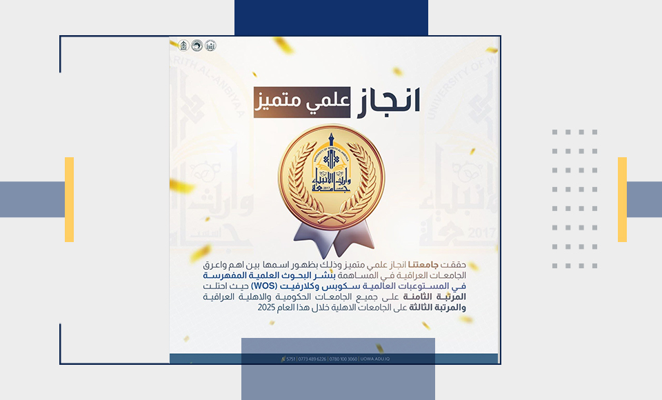 أحرزت جامعة وارث الأنبياء (عليه السلام) إنجازًا علميًا جديدًا يُضاف إلى رصيد إنجازاتها المتنامي، بعد أن تم إدراجها ضمن قائمة أبرز الجامعات العراقية في مجال نشر البحوث العلمية المفهرسة ضمن المستوعبات العالمية الرصينة مثل Scopus وWeb of Science.